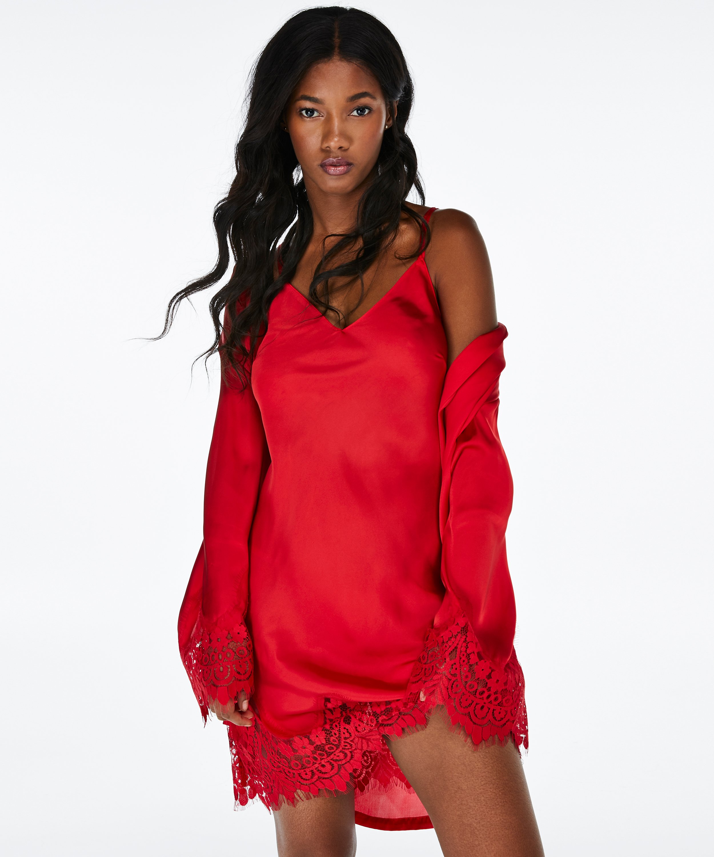 Feel kissable and flirtatious! This slip dress features fabric that has a satin look and feel and is finished with lace.