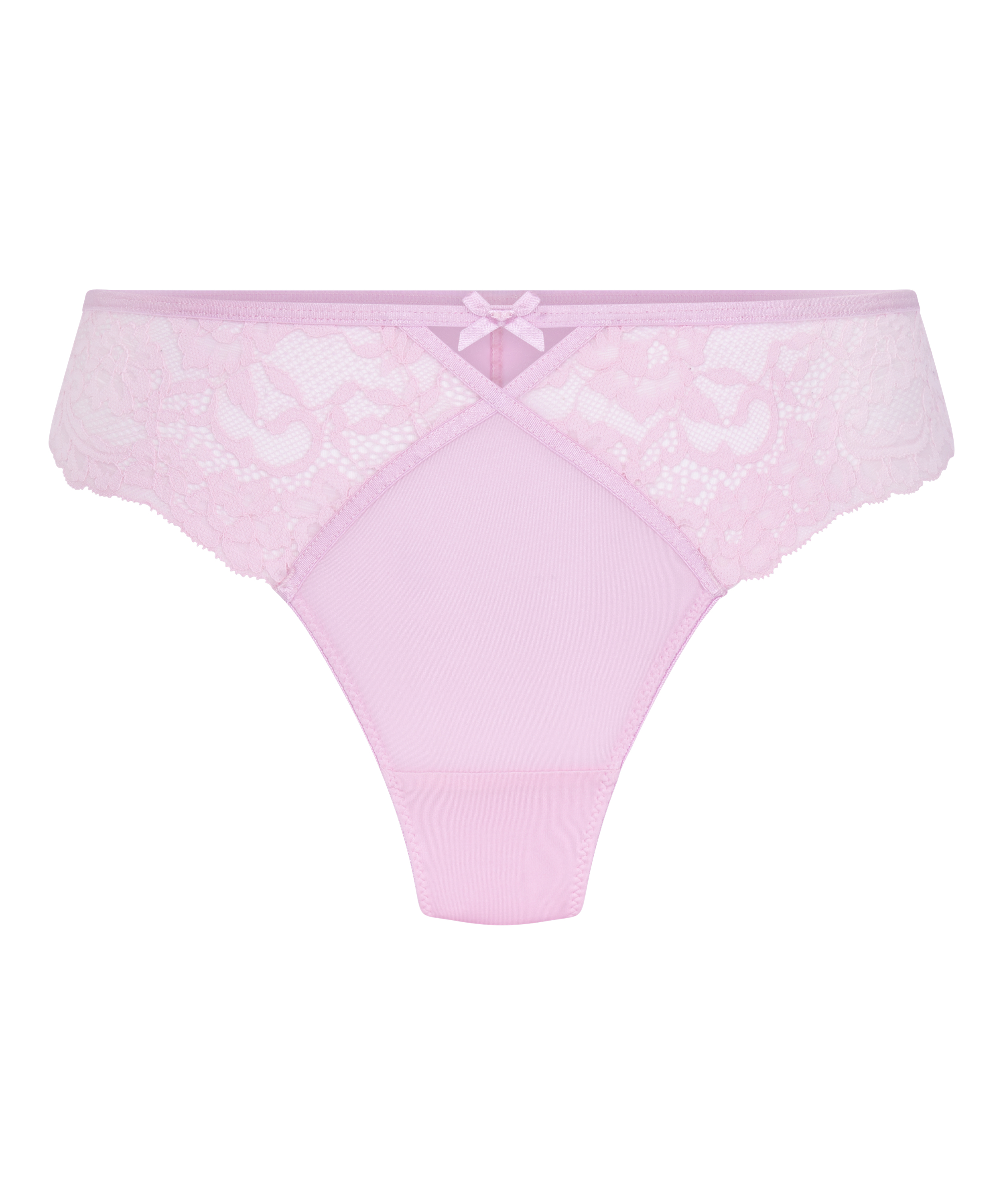 This cheekini features a stylish cross detail on the front, complemented by a playful cutout above. Delicate lace and a decorative bow add an elegant touch.
