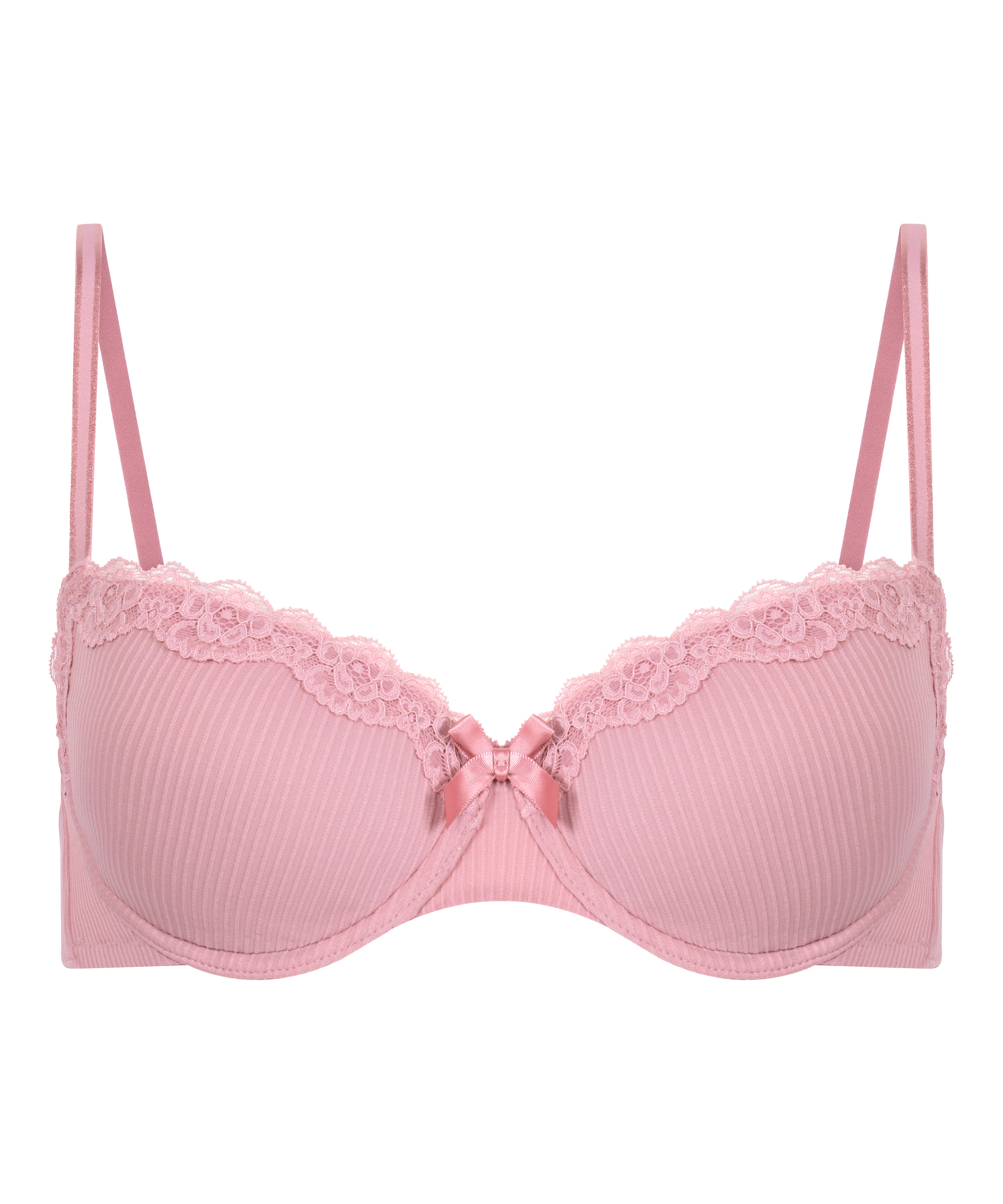 This padded underwired bra is finished with lace details on the top of the cups. Between the cups is a small bow for an extra sexy look. Mix with the matching items!
