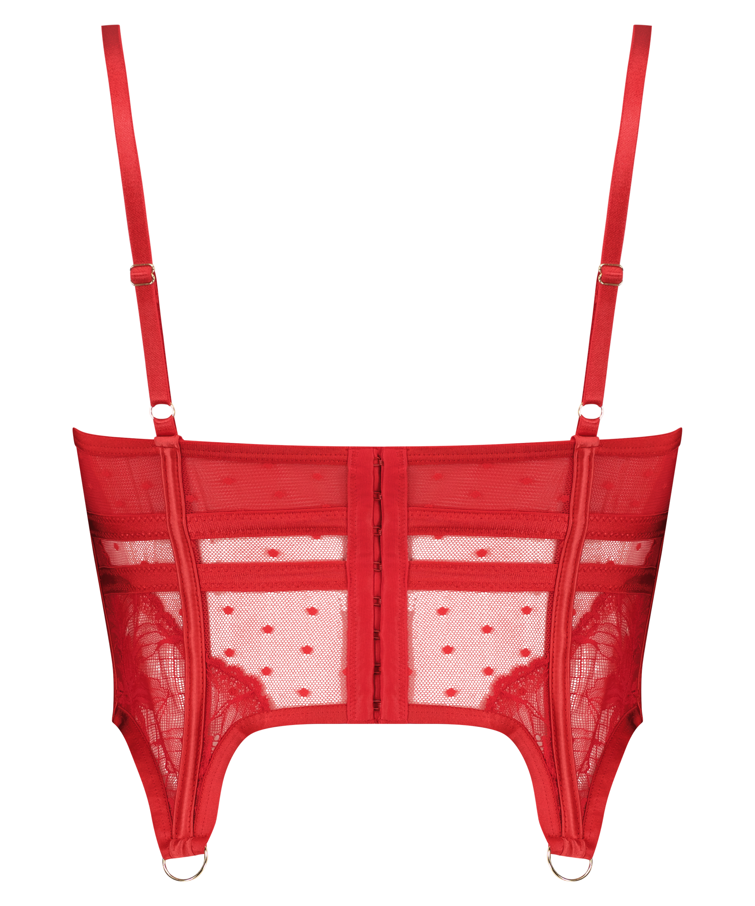 Feel sexy in this beautiful bustier! With comfortable unpadded cups featuring cut out and strappy details. It is super supportive due to the frontal, side, and back boning which will make you look amazing. It has a complete lace and mesh semi-transparent look, and potential to attach hosiery straps. Complete the set with the matching knickers! Part of our Private Collection.