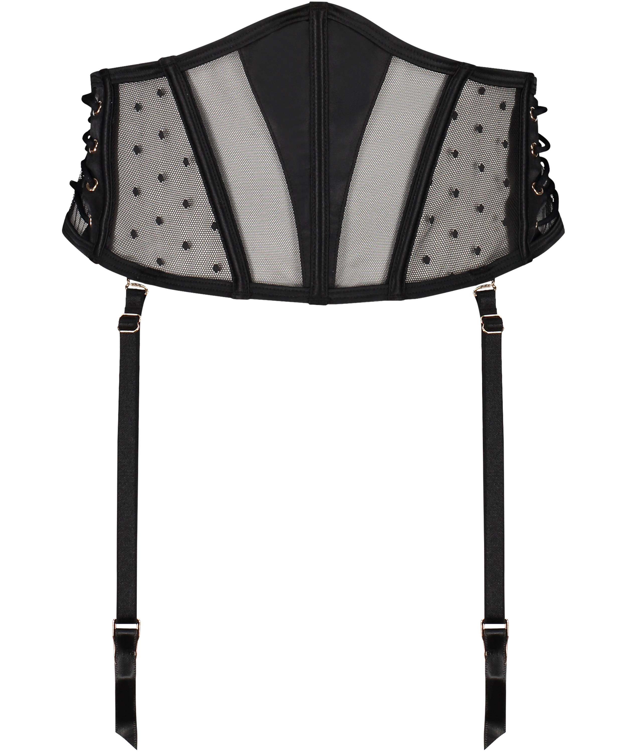 Want to make a seductive statement? Then this suspender belt is your go-to item! Made with beautiful dotted mesh fabric and sexy lace up details, this belt with complete your lingerie set. This suspender belt features detachable straps for adding your favorite hosiery!