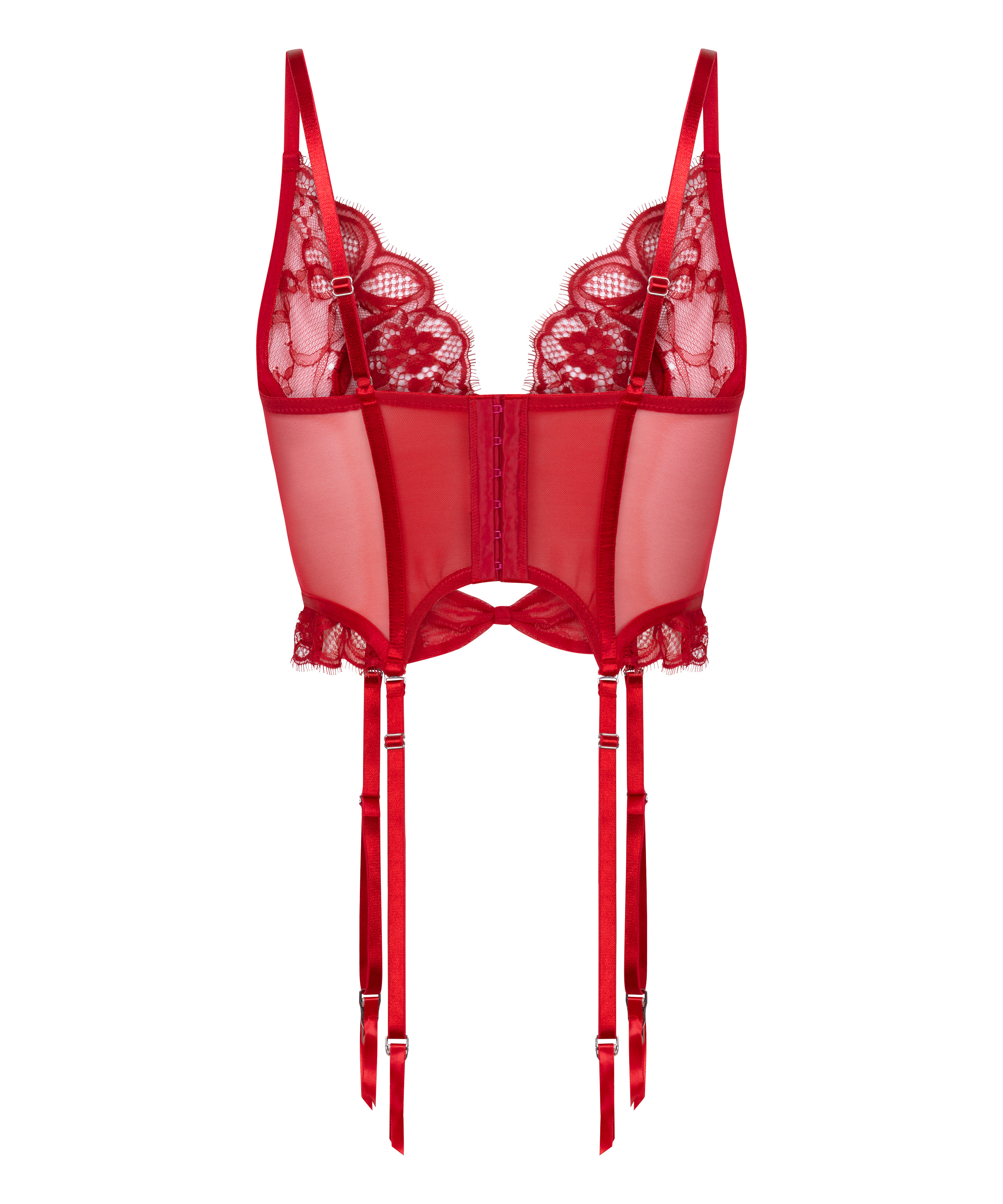 Celebrate the season in style with this mesh lace bustier corset, featuring delicate underwire support and adjustable straps for the perfect fit. Unpadded for a natural look, its structured silhouette is adorned with sweet bow details for a festive, flirty touch. The sheer lace adds elegance while keeping it playful and cute. Ideal for holiday nights or gifting yourself something special. A charming must-have for your Christmas lingerie collection!