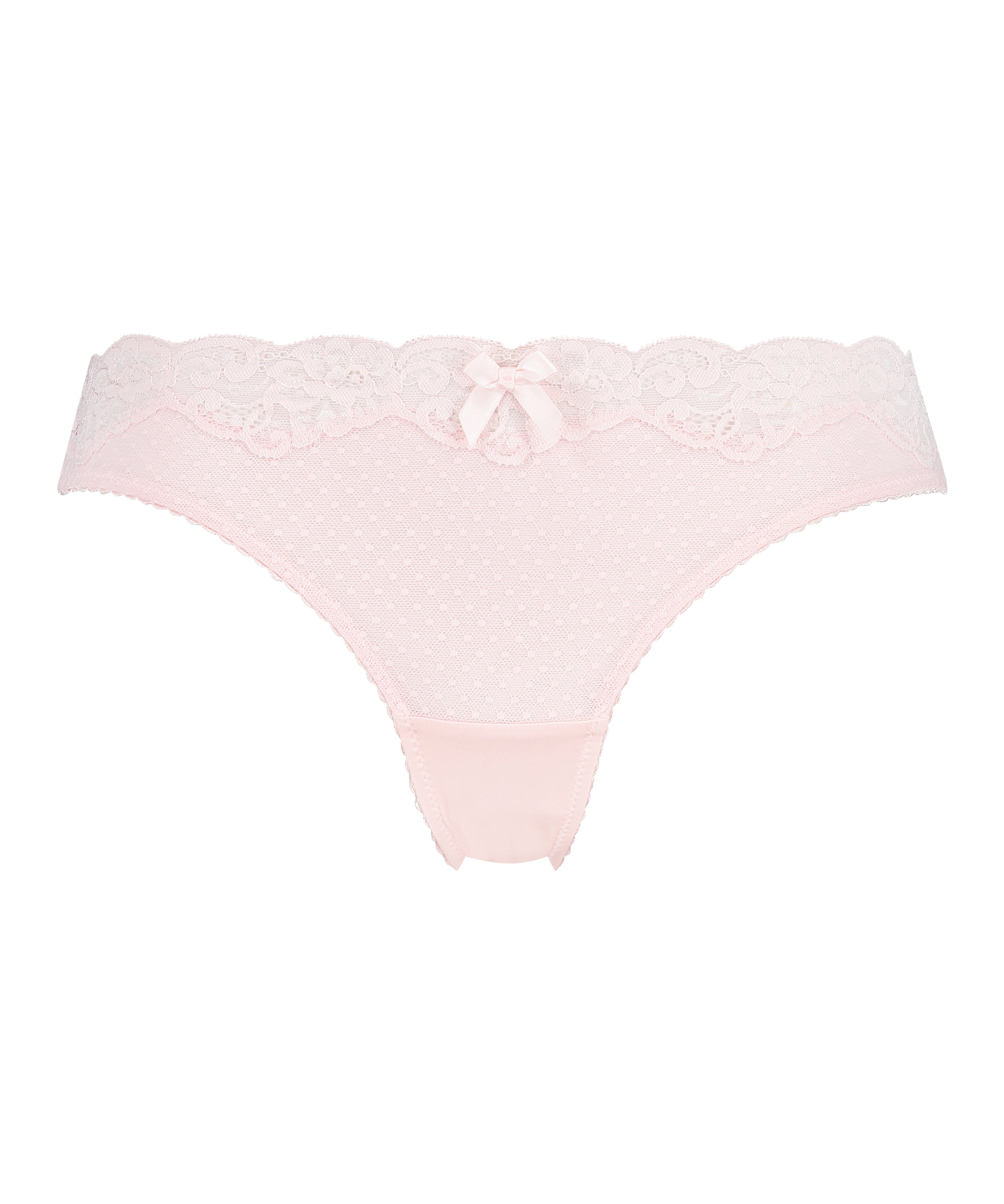 This thong is finished with lace and is made of semi-transparent mesh. The mesh has a self-woven dot pattern. The lace gives this thong a sexy look! Combine it with the matching bra for a complete set.