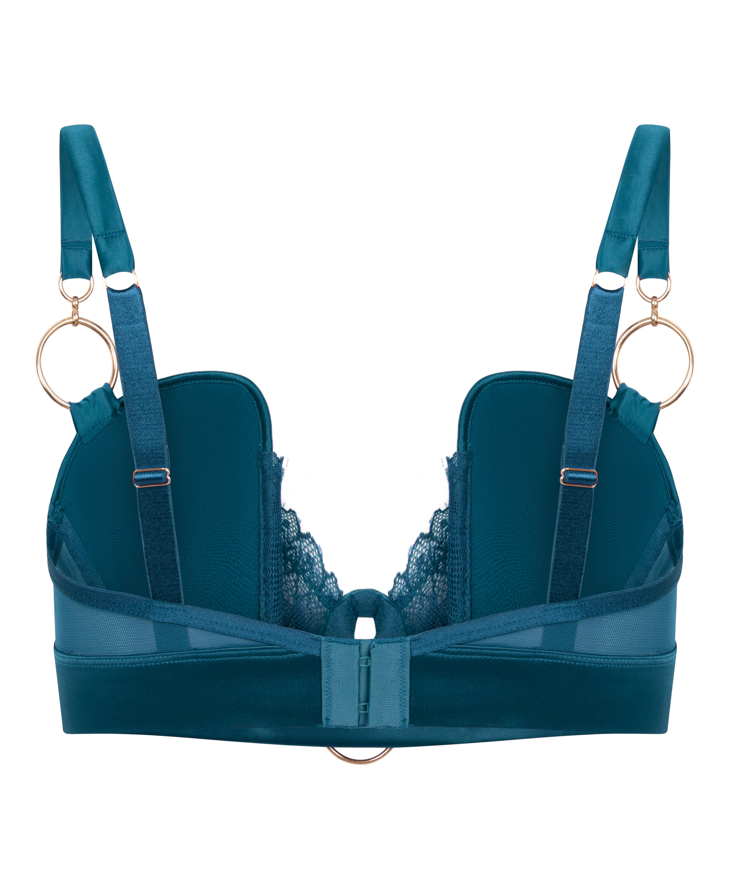 Add a touch of luxury to your lingerie with this satin bra, featuring sheer mesh panels and elegant golden hoop details. Lightly padded and underwired for a flattering lift and shape. Adjustable straps ensure a perfect fit, while the mix of textures creates a bold, feminine look. Perfect for special occasions or elevating your everyday style. Pair it with the matching string for a complete look!