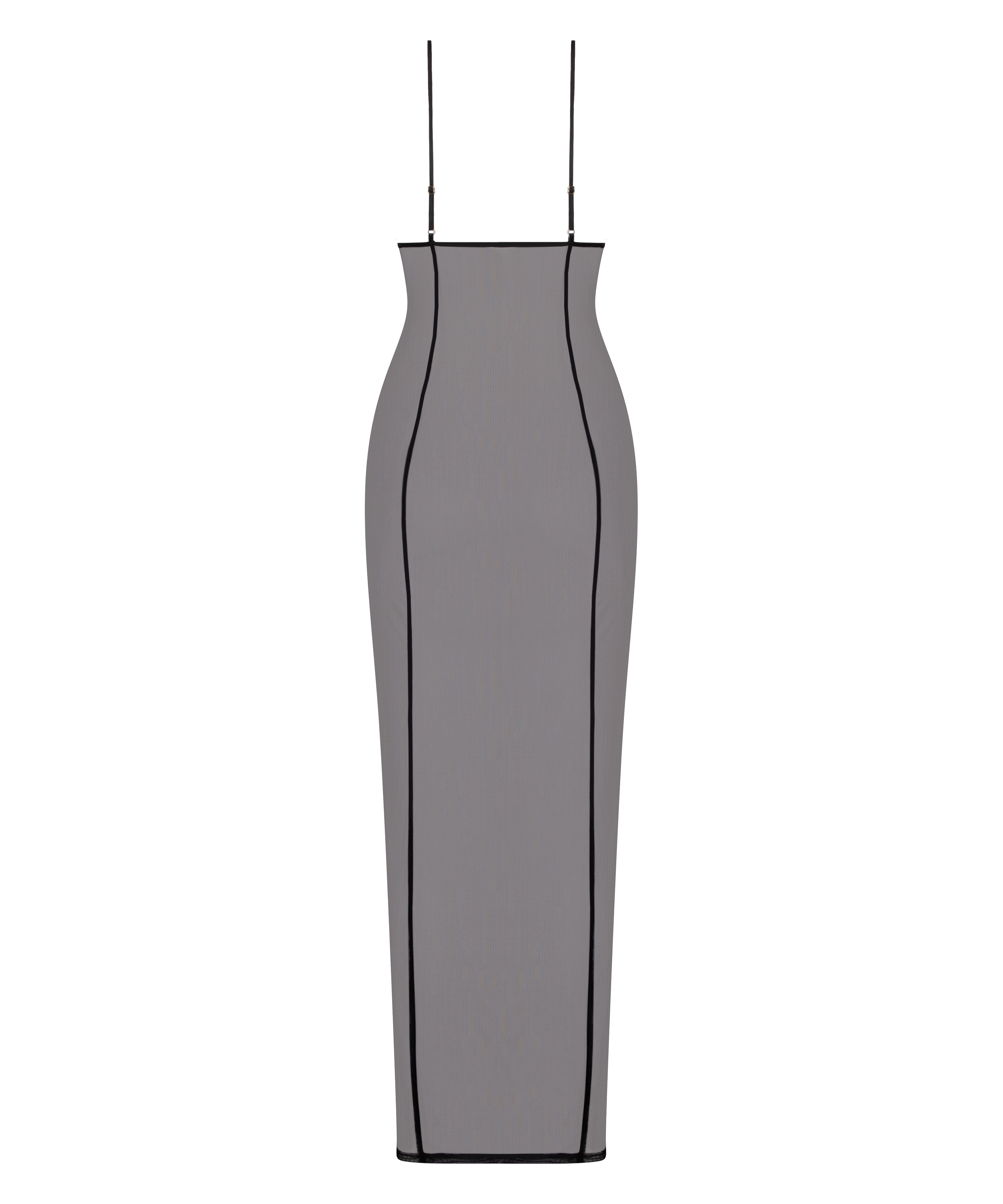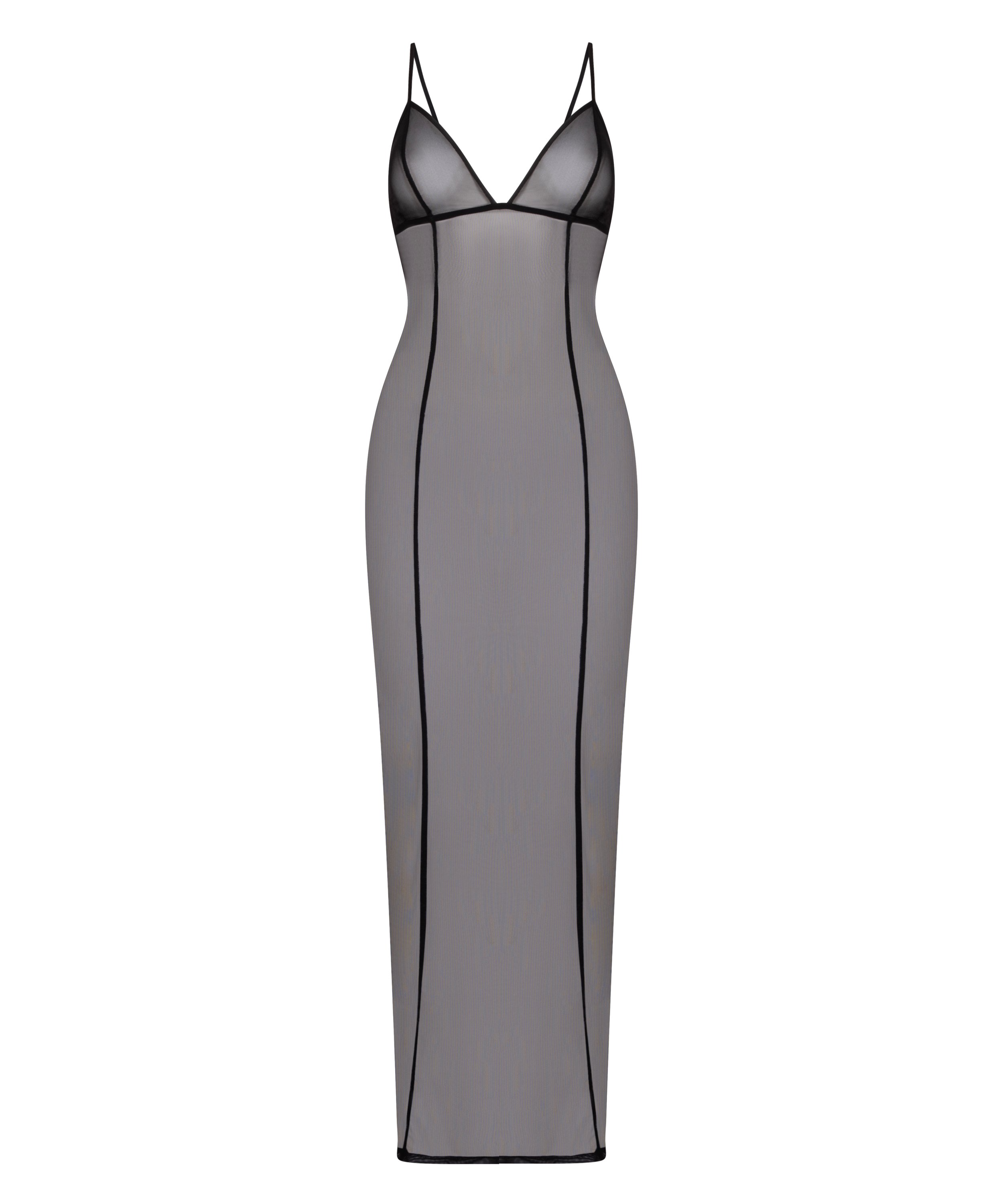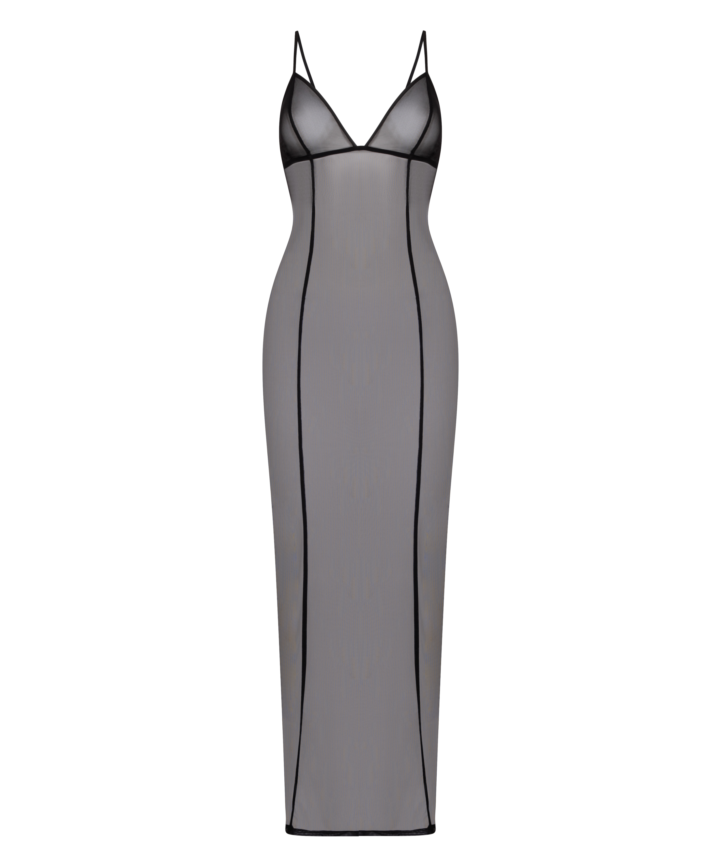 This slip dress is incredible! This dress is crafted entirely from mesh, creating a sheer, captivating look that highlights your unique style. Designed for those who appreciate daring fashion, this maxi dress combines sensuality and sophistication, showcasing a striking balance of texture and transparency.
