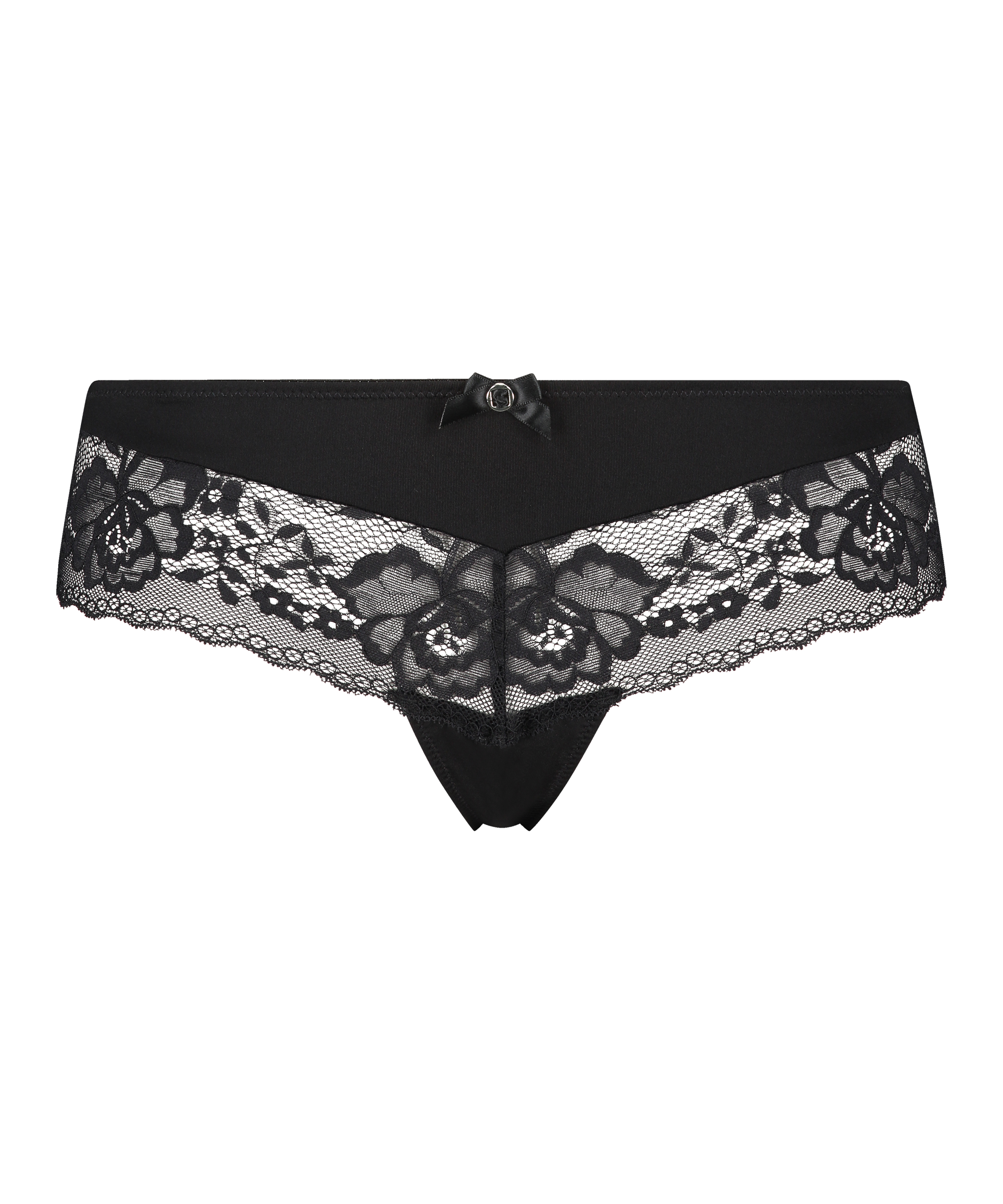 These Brazilian knickers feature a combination of semi-transparent lace and shiny fabric. The small bow on the front adds a pretty finishing touch. Combine with the matching bra for a complete set.