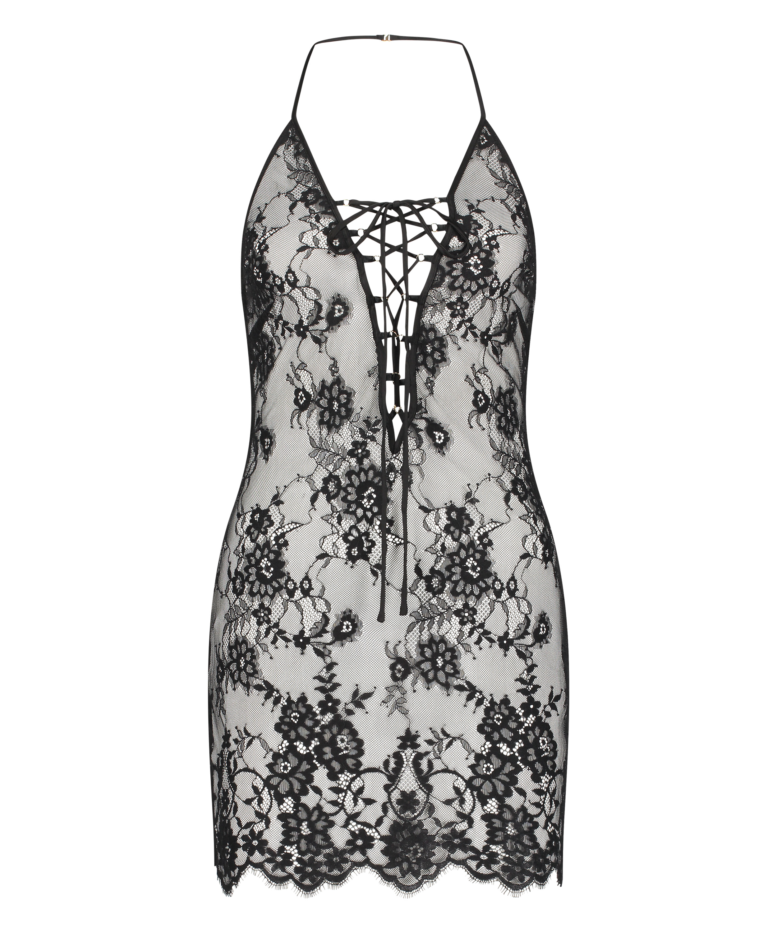 Look fabulous in our halter lace slip dress! Made from a lace fabric, this semi-transparent dress has a halter neck. Pair it with some a nice kimono to finish your evening look.