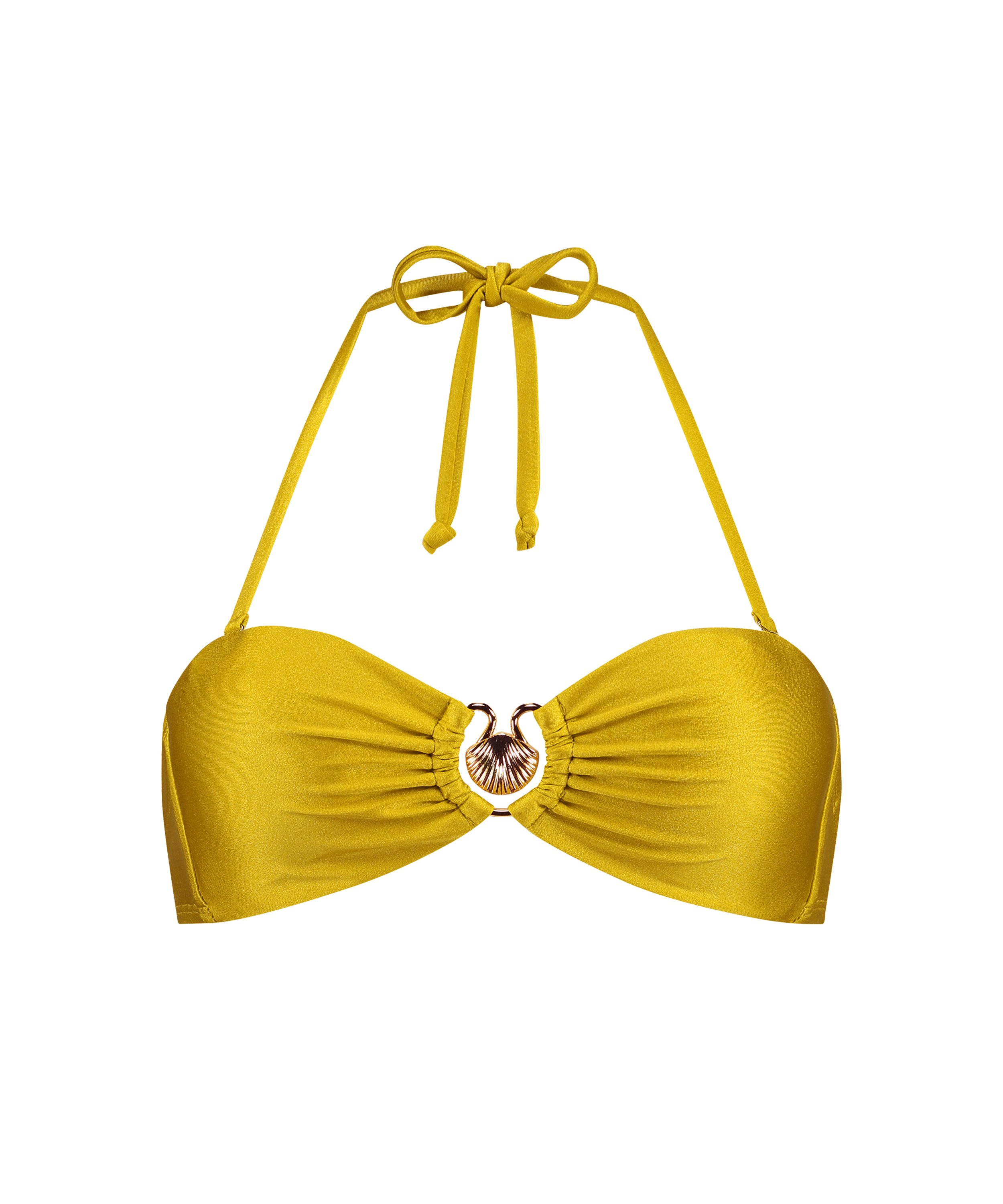 This bikini top gives your beach look a chic appearance! The top is made from a shiny material and has golden details. The bikini top can also be worn strapless. Combine with the matching bikini bottoms from this collection.