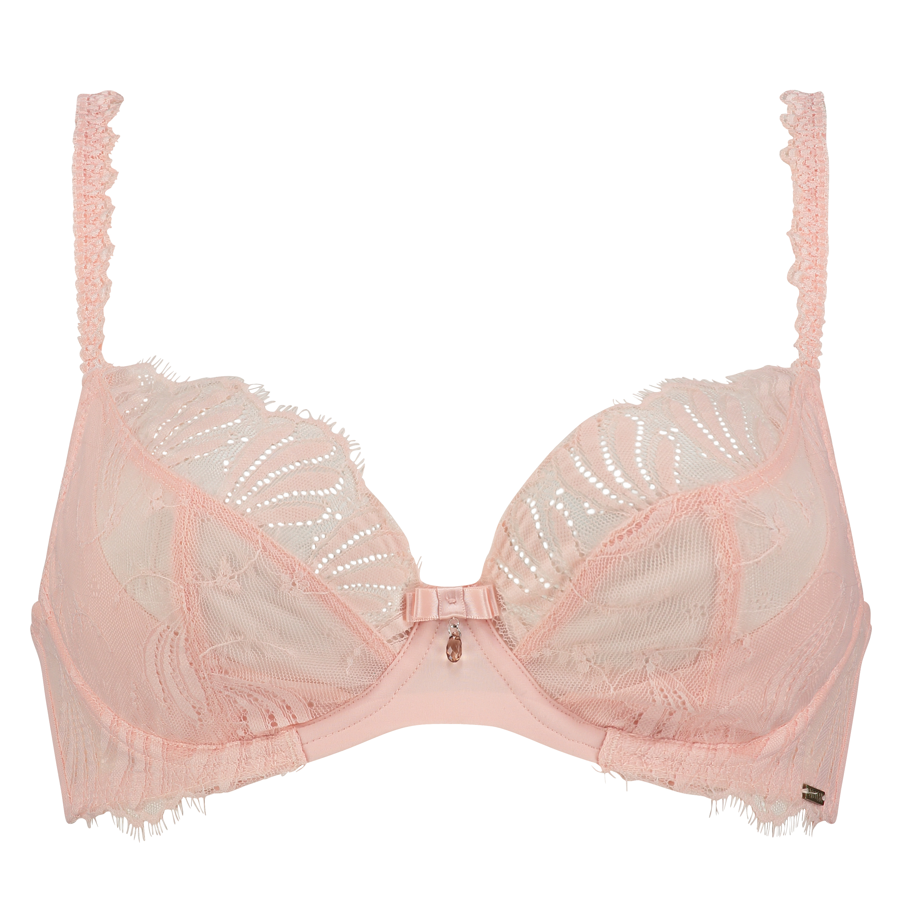 This luxurious non-padded bra from the Noir collection has semi-transparent lace on the front and mesh fabric at the back. The shoulder straps are decorated with subtle ruching. A bow and a pendant between the cups add finishing touches.