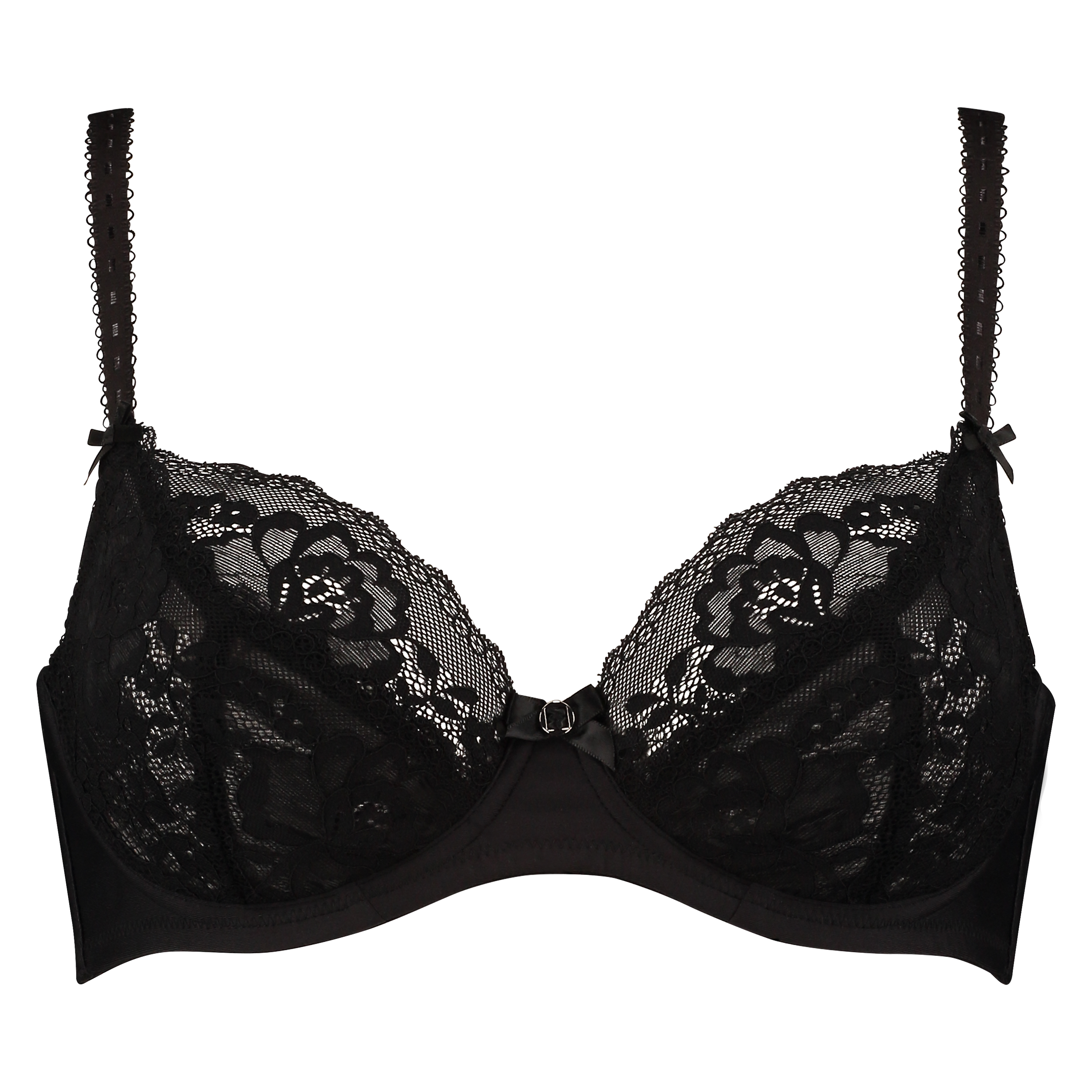 This non-padded underwired bra features semi-transparent lace cups, decorated shoulder straps and bows on the shoulder straps and between the cups.