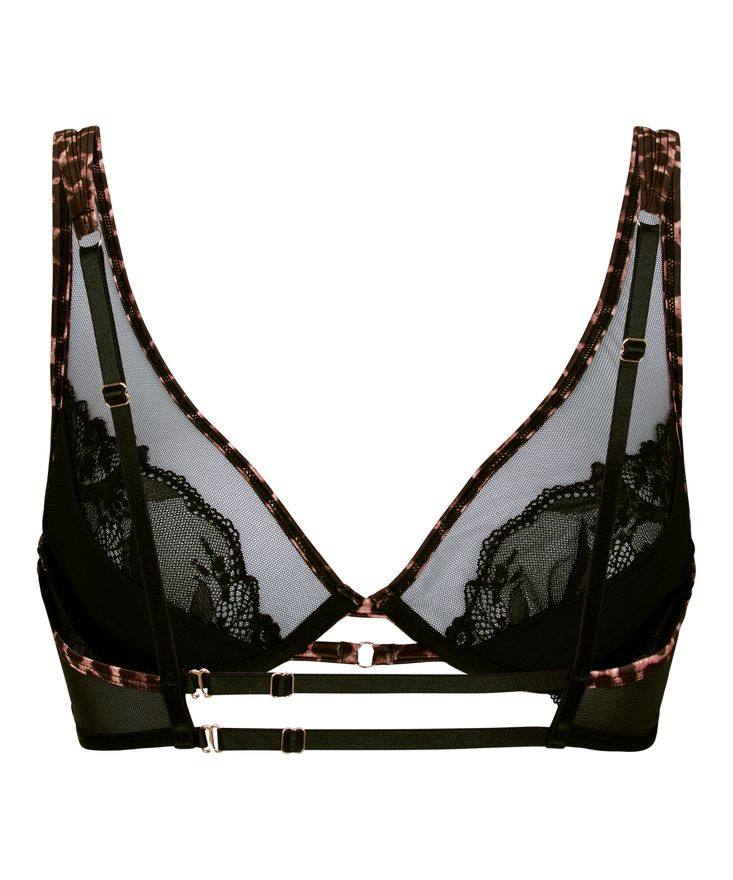 Lightweight longline bra in sheer black mesh with delicate lace cups and contrast animal-print edging. The extended band and multiple strap details create a structured, corset-inspired silhouette while still feeling airy. Underwires provide natural shaping without padding, keeping the look soft and defined. Adjustable straps and hook closure help customise the fit. Designed to be both supportive and statement-making under or over clothing.