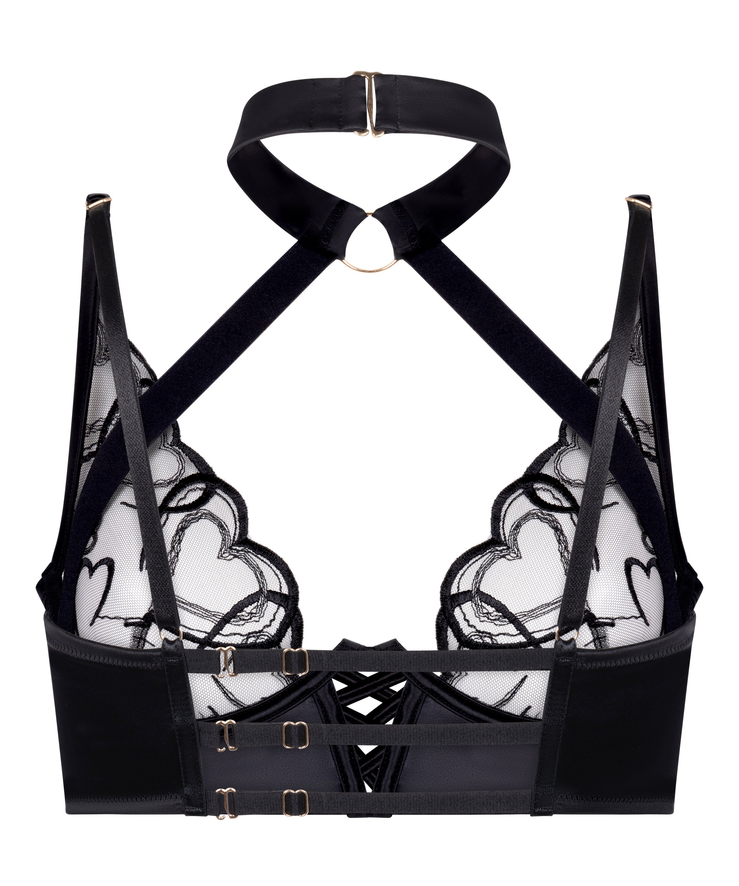 This underwired bra blends structure and style with its soft lace cups and unique X-back closure. Unpadded for a natural silhouette, it offers gentle support while keeping things light and feminine. Adjustable straps ensure comfort, while the heart lace details add a romantic twist. A bold yet delicate piece to complete your dreamy lingerie set.