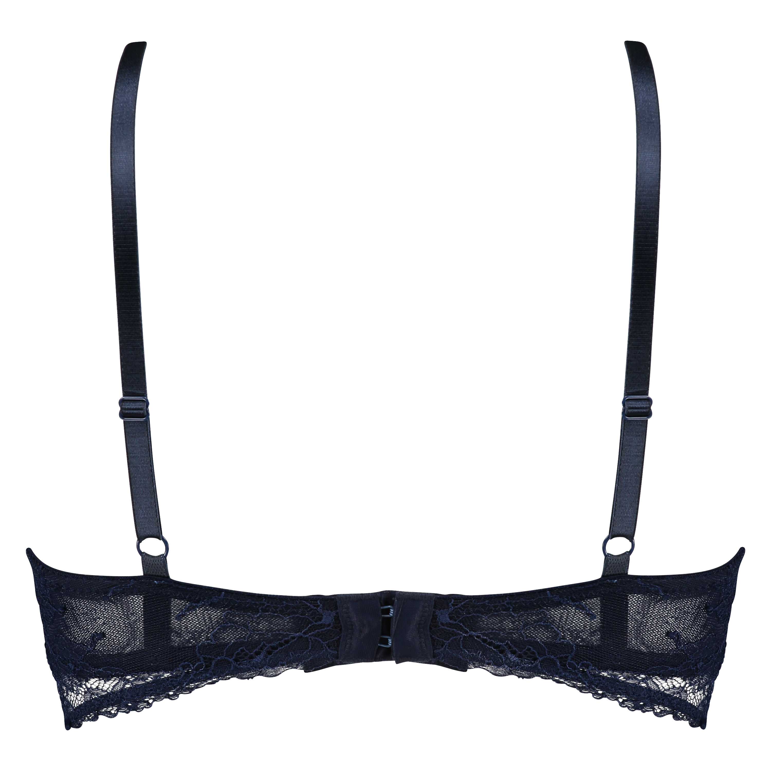 This cream-coloured padded longline bra is finished with dark blue lace and a blue bow between the cups. The undersides of the cups and the back are made from dark blue lace.