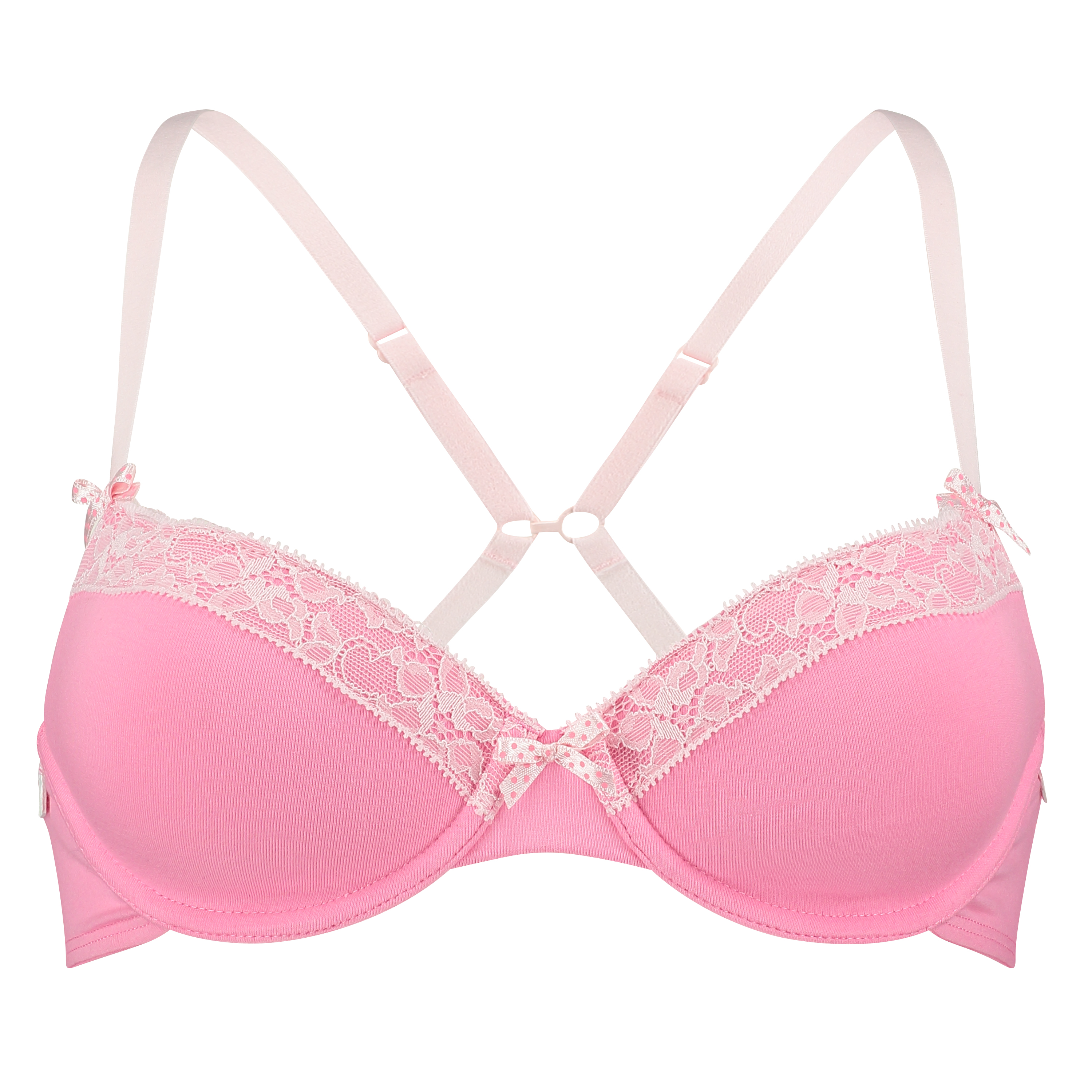 This cheerful padded and underwired bra is ideal as a girls first bra. The cups are finished with lace edging and a small bow between the cups.