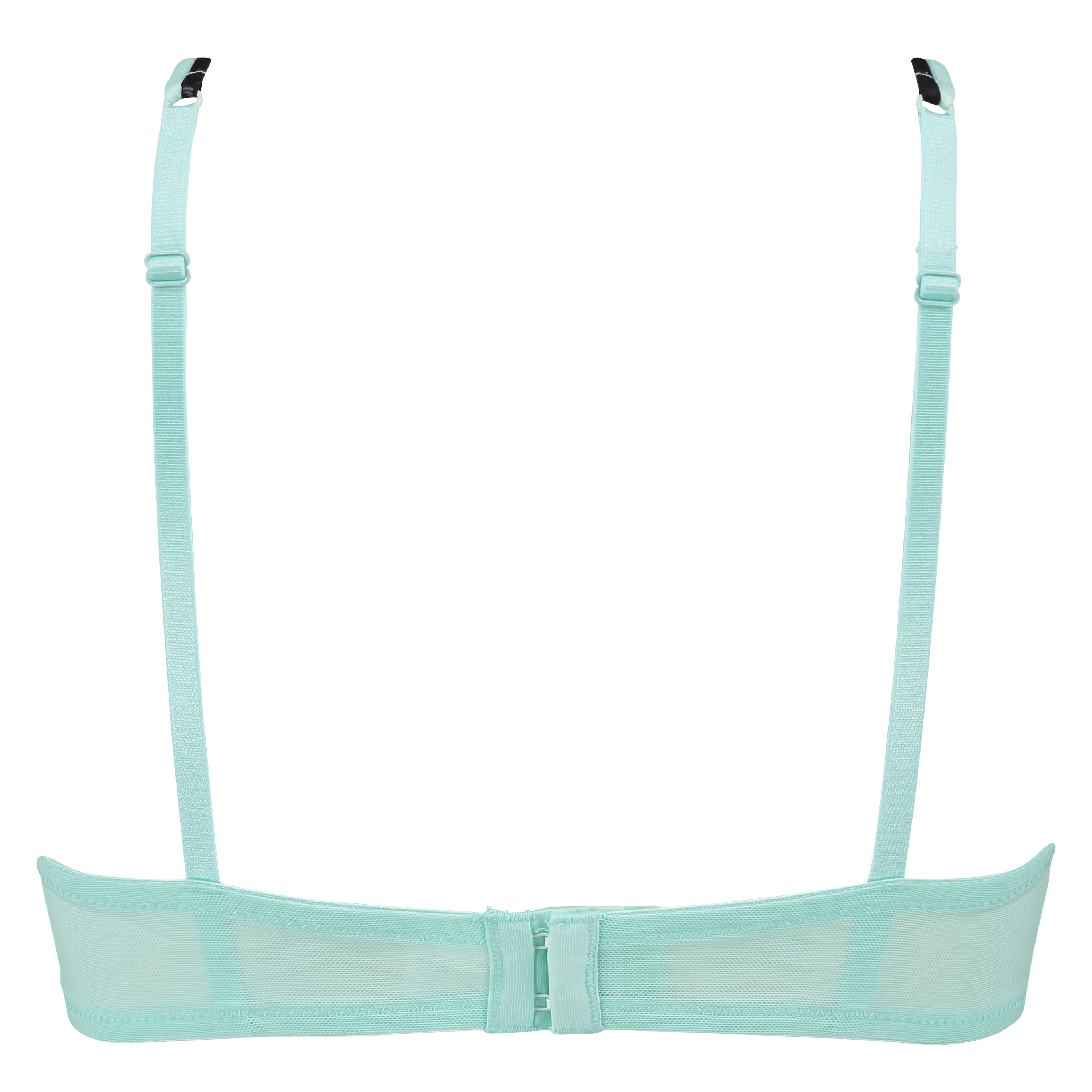 This padded and underwired bra is a lovely blue colour. The cups are finished at the top with black lace edging. The bra has double shoulder straps and a small bow between the cups.