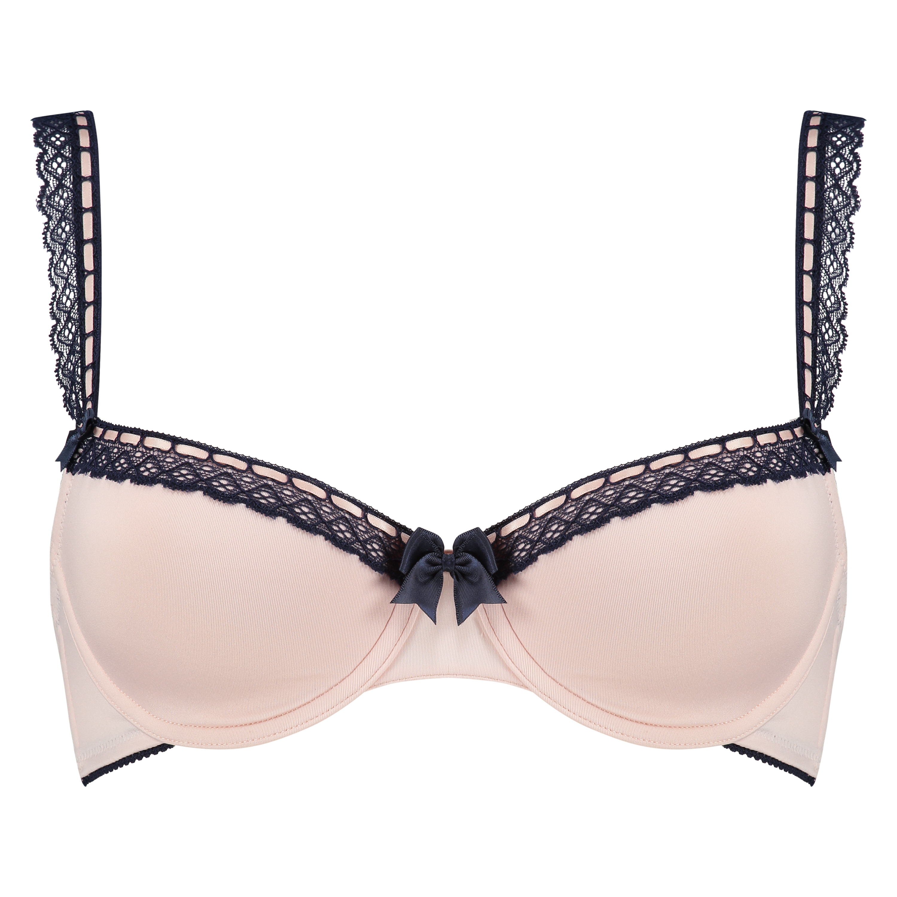 This padded and underwired bra is made from smooth fabric. It has lace edging along the top tops of the cups, which is continued on the shoulder straps. A small bow on the front adds a finishing touch.