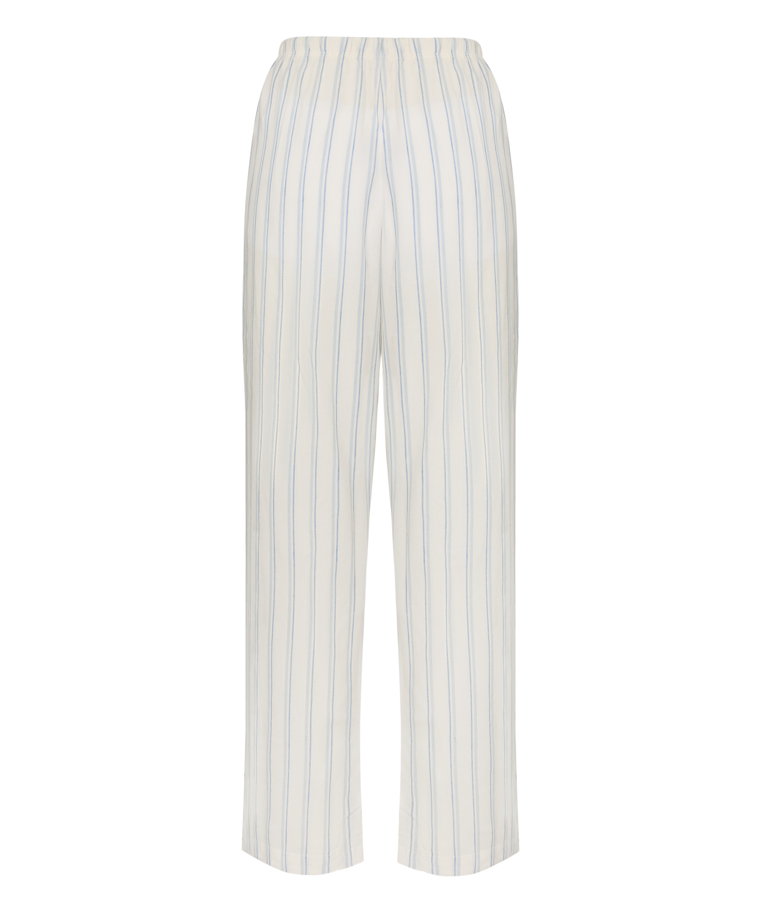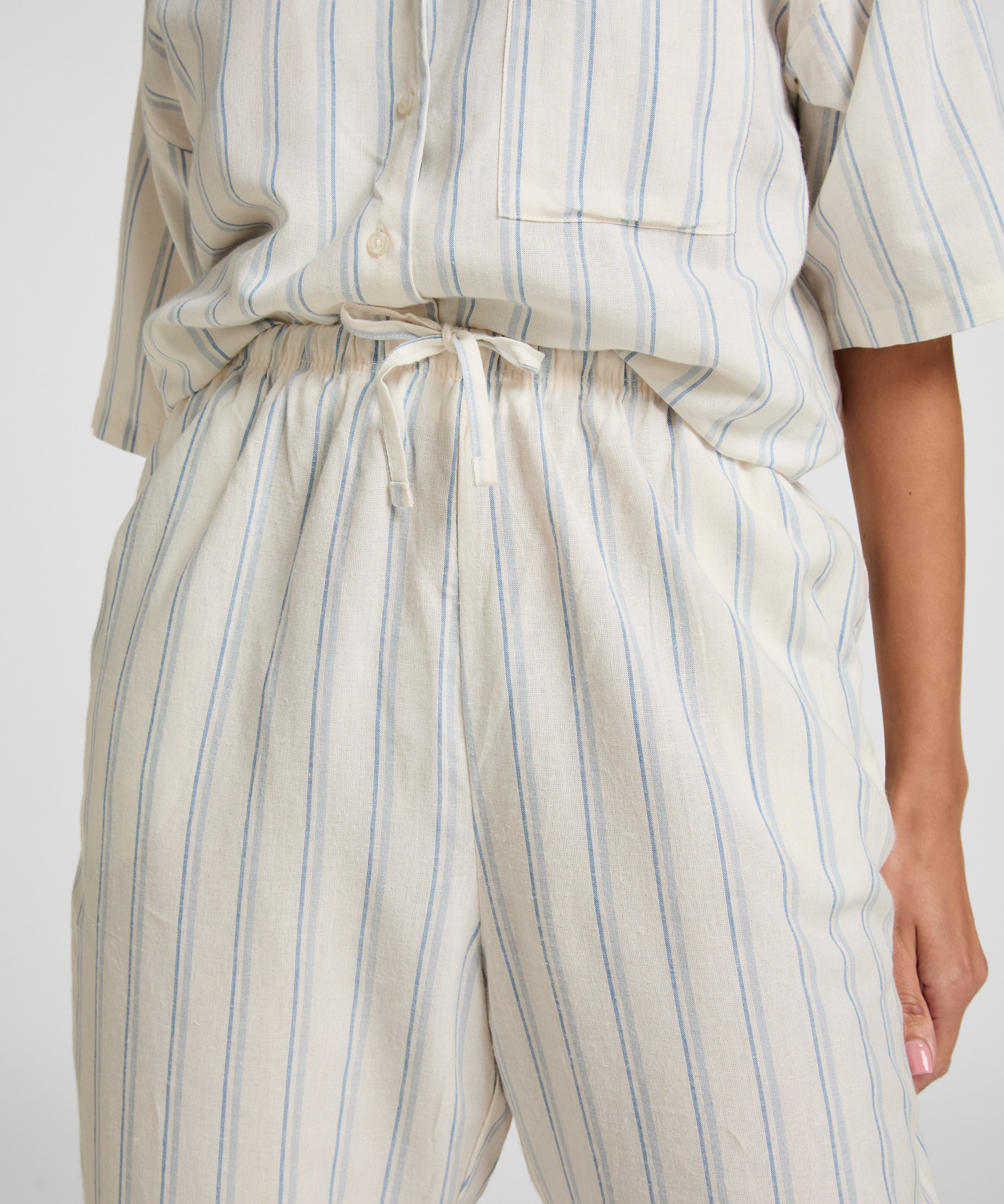 Relaxed linen trousers in a breathable woven fabric with a soft, airy feel. The elastic waistband with drawstring offers an adjustable, comfortable fit. Straight wide legs and vertical stripes create an easy, laid-back silhouette. Perfect to pair with the matching robe or wear as lightweight loungewear on warm days.