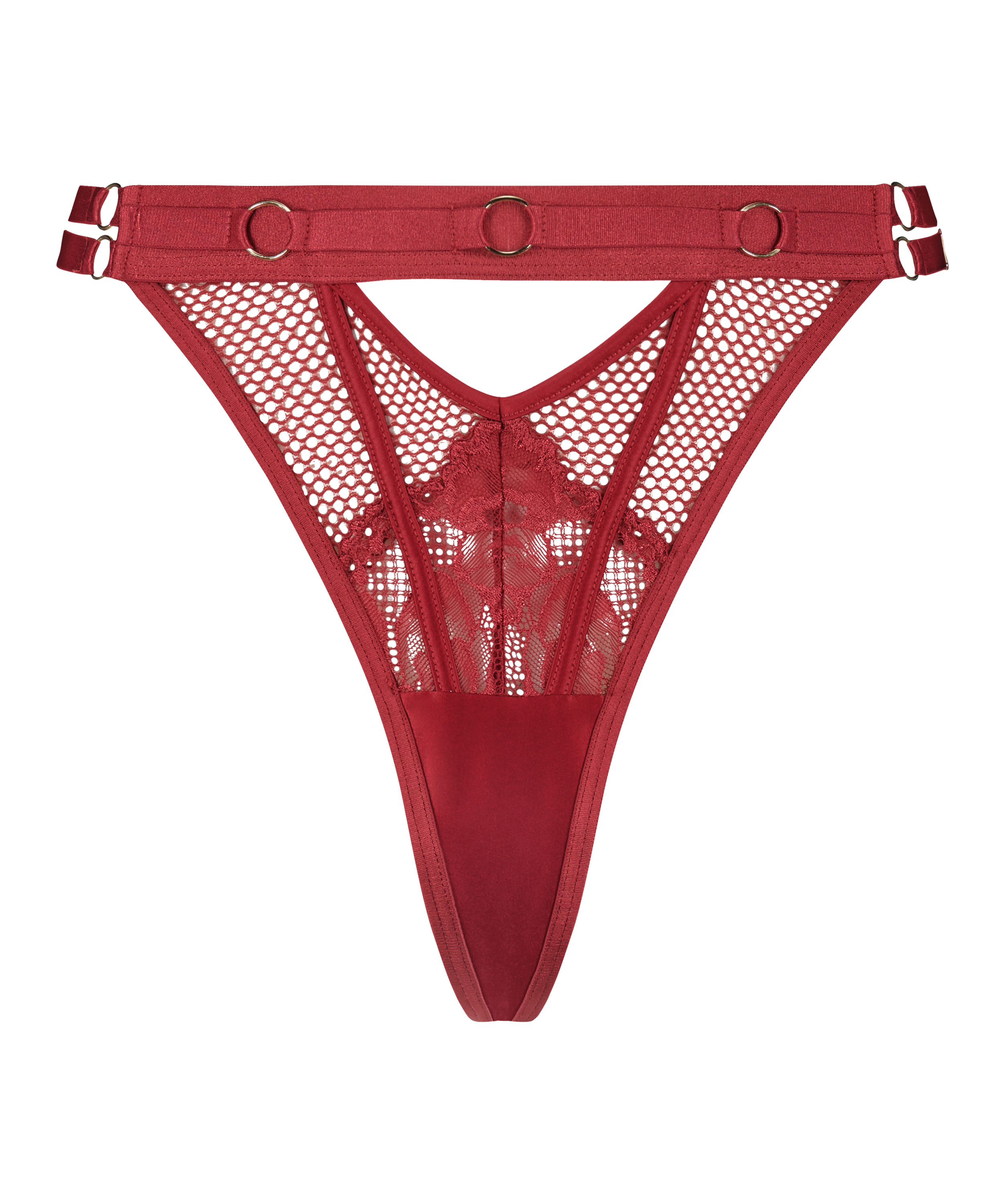 Take things to the next level with this super sexy thong! Made from fish net material, decorated with lace and strappy details for a spicy look. There are cut out details on the front and back, along with hardware on the thick band. Find the bustier and complete the look!
