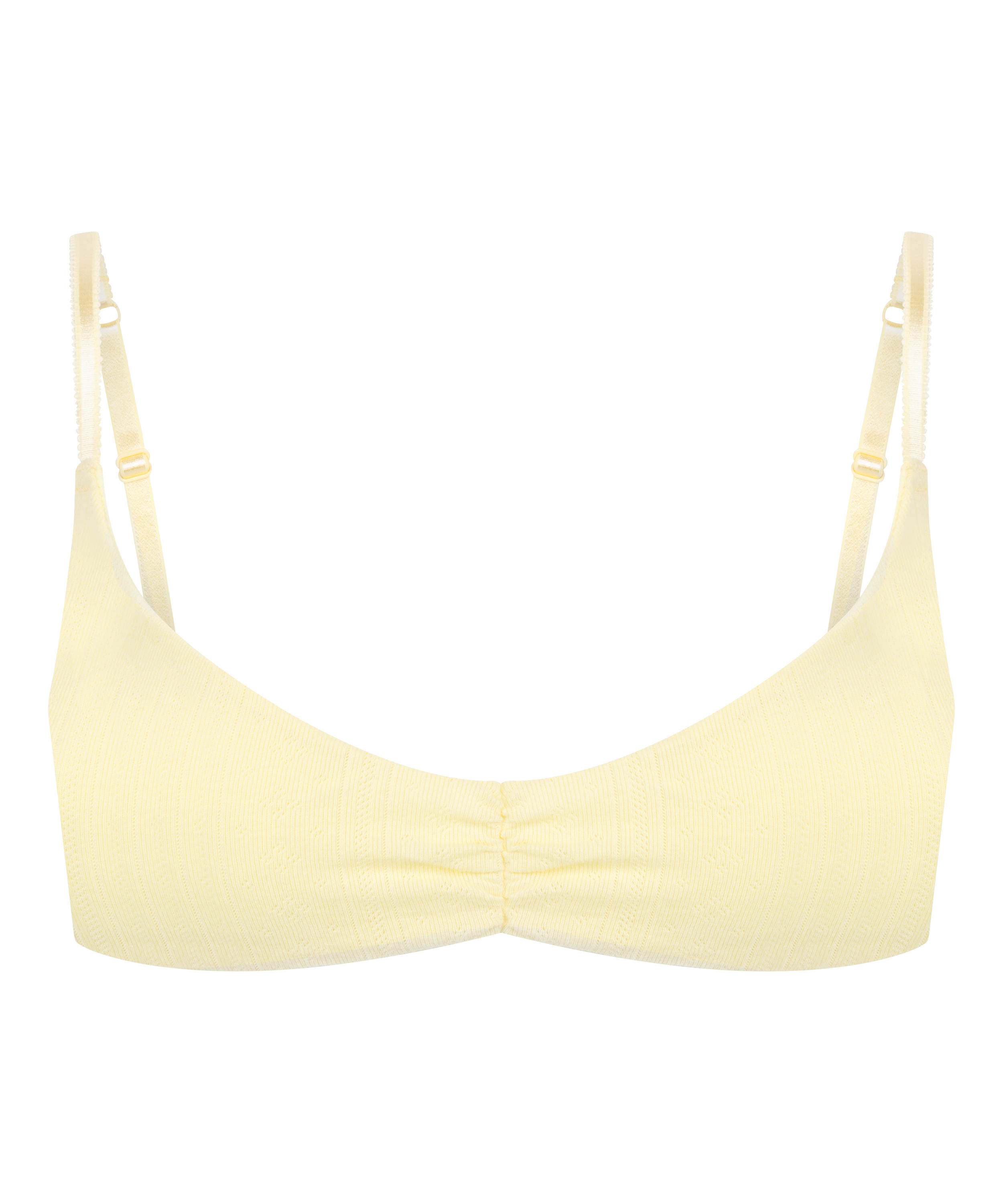 Discover ultimate comfort and a touch of charm with this bralette. The soft pointelle fabric provides a comfortable fit, while the subtle texture adds a delicate touch. The ruching detail in the front enhances your natural shape, giving this bralette an elegant finish