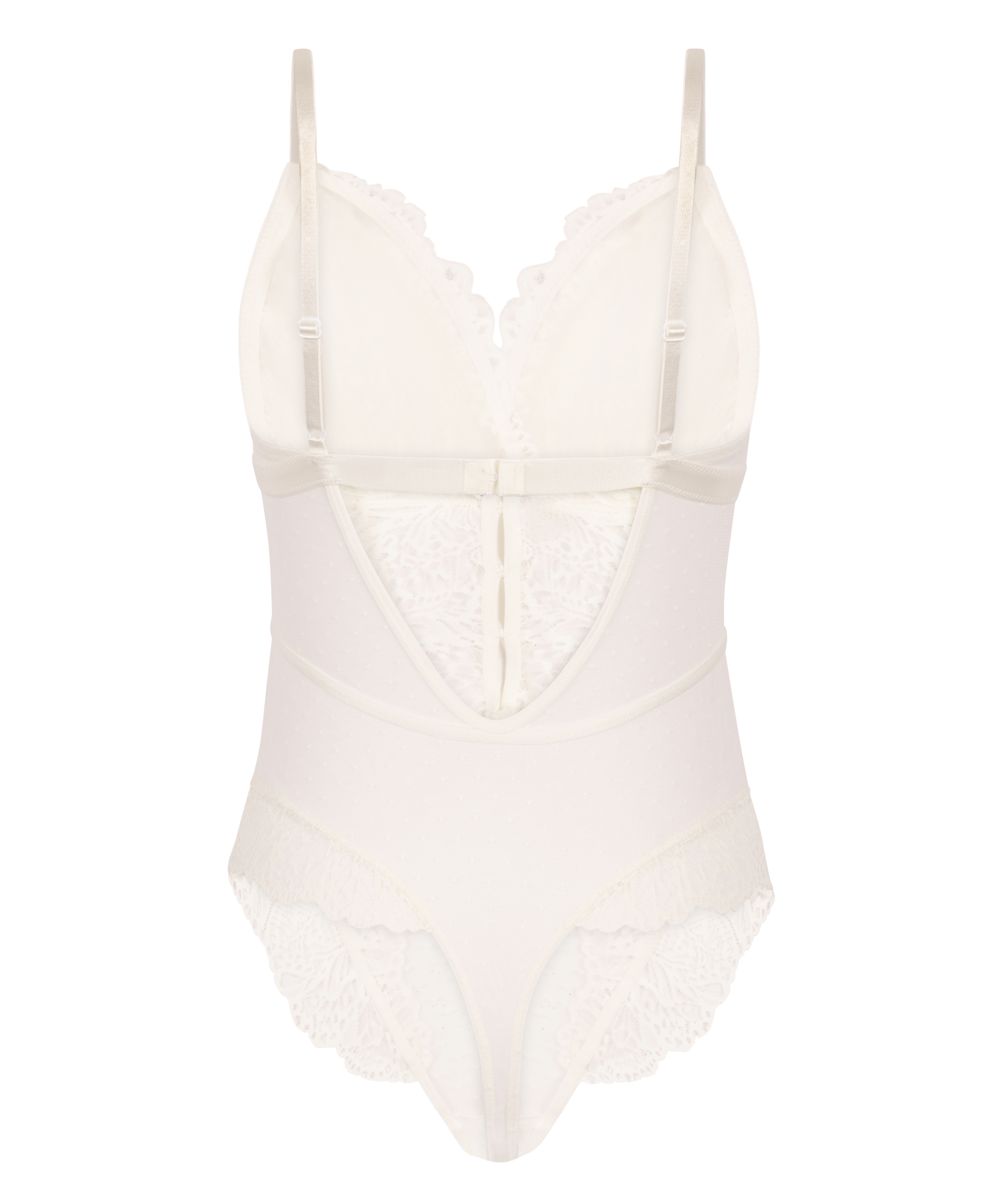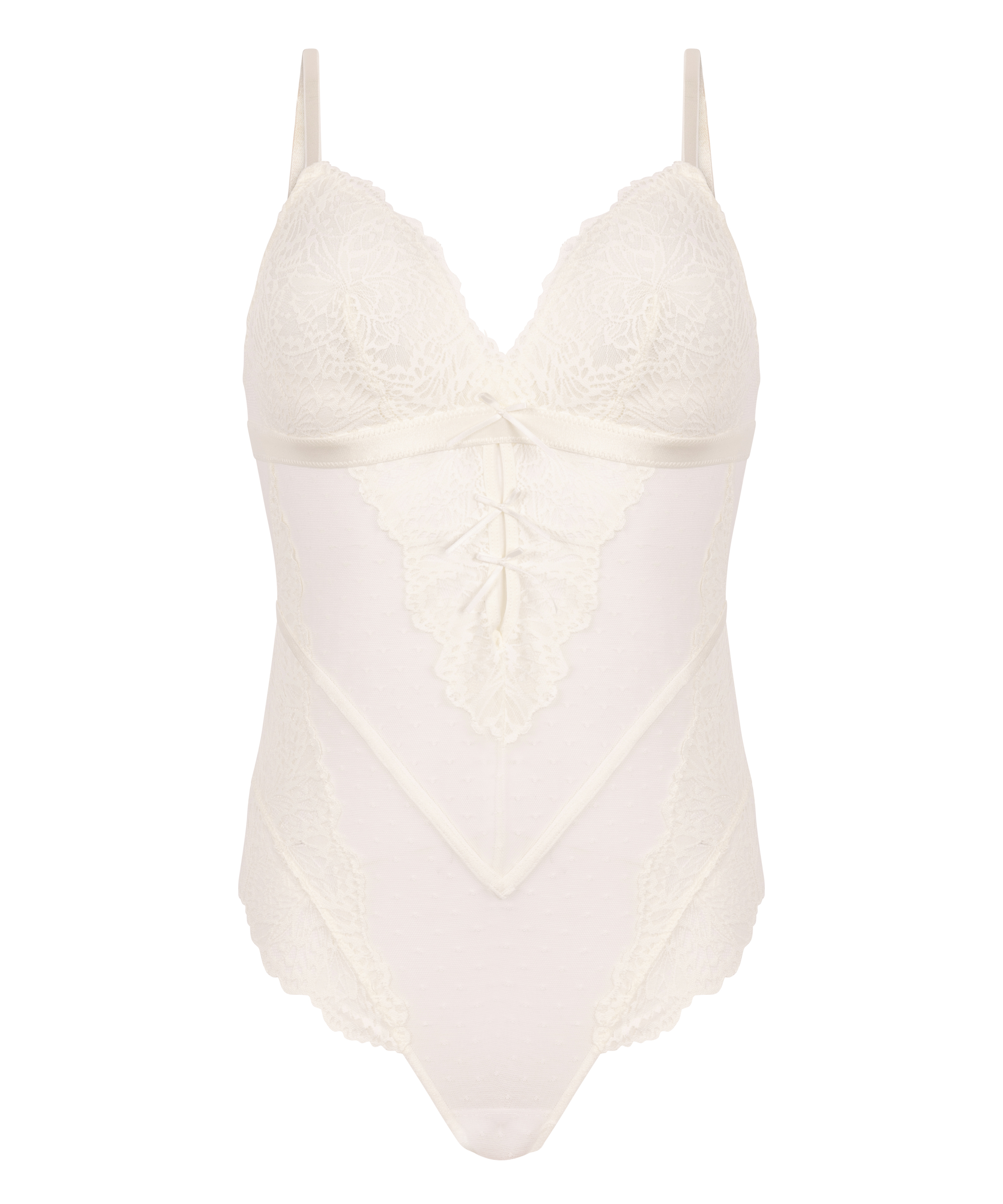 Charm in this beautiful body, crafted from mesh fabric and adorned with lace detailing on the neckline and sides. Decorative bows add a playful touch.
