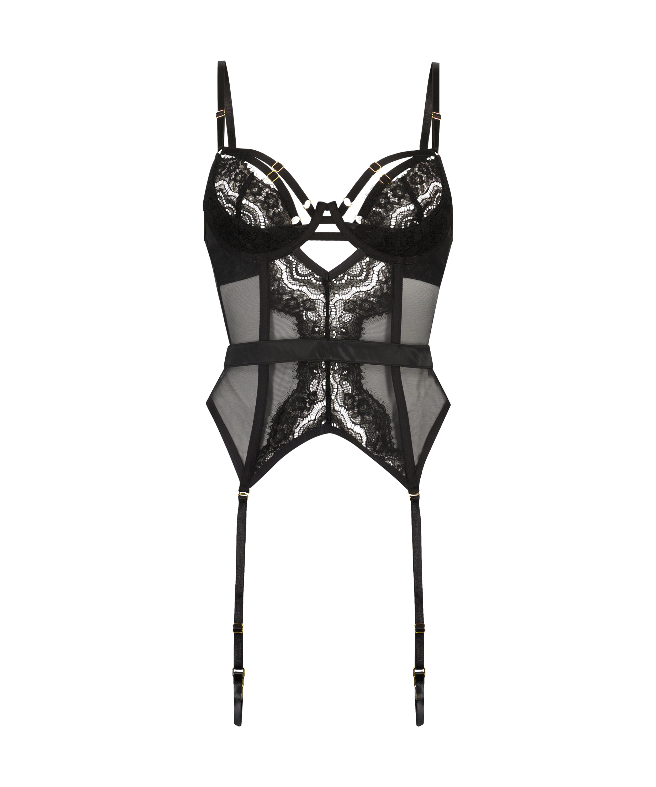 You'll feel irresistibly sexy in this bustier! The bustier is beautifully finished with lace and mesh. The bodysuit is fitted with suspenders, so you can be super sexy wearing it with your favorite stockings! Combine with the matching knickers to complete