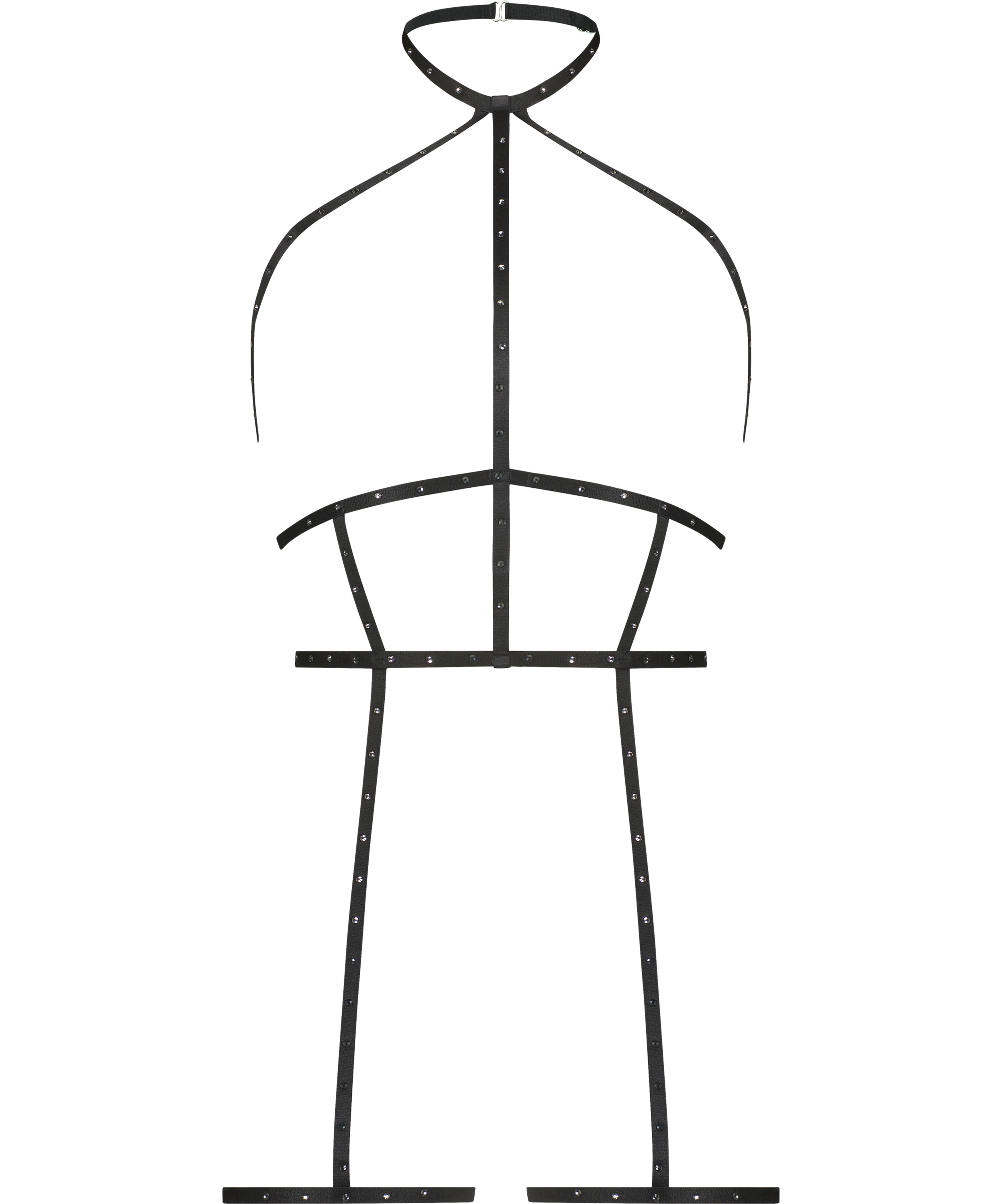 Add spice to any set with this super sexy body harness. With sparkly rhinestones perfectly placed throughout the whole harness. Completed with suspenders and a synched waist design. Add this to any sexy Private collection set!