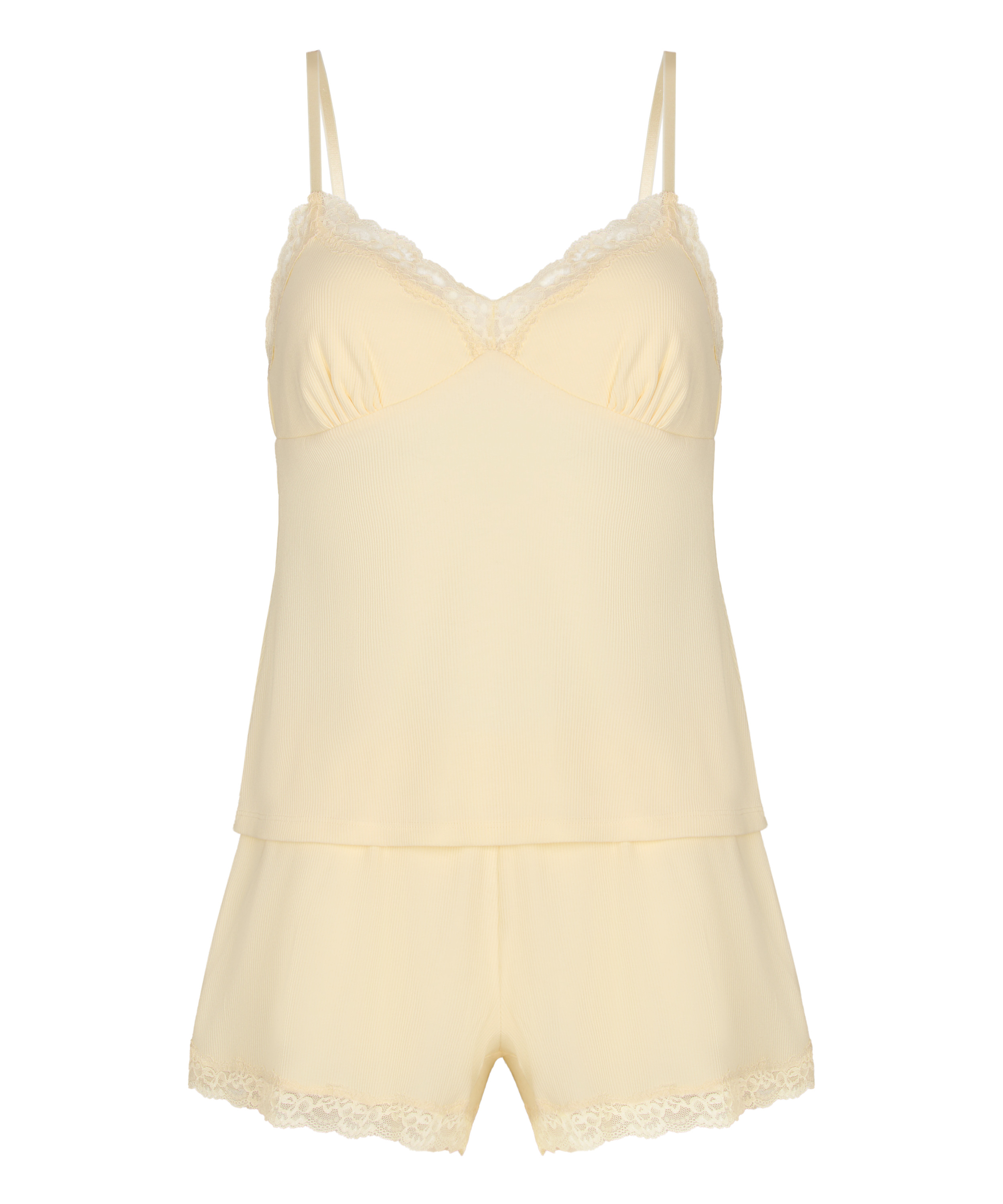 This pajama set is the perfect mix of cute and cozy, designed for sweet nights and relaxed mornings. Made from soft ribbed cotton, it feels breathable and gentle on the skin while offering a comfy, flattering fit. The cami top and matching shorts are finished with delicate lace trim at the edges for a feminine touch. Playful yet stylish... the girly vibe you’ll love lounging in.