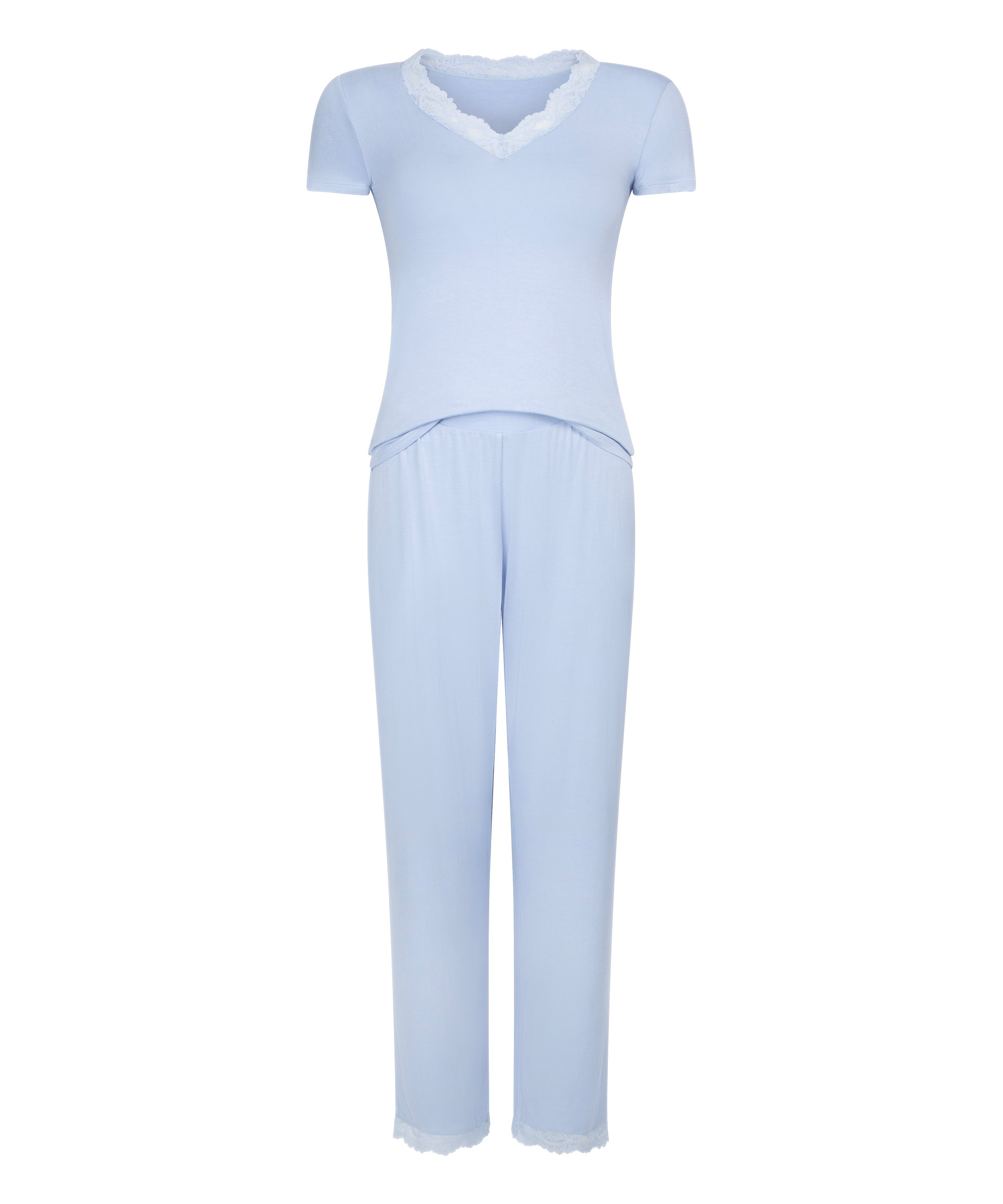 Relax in style with our pyjamaset, desgined for ultimare comfort and elegance. This two-piece set features soft, breathable top with short sleeves and a flattering V-neckline adorned with lace. Paired with long, flowy pants for a relaxed fit and lace details on the bottom. This set is perfect for lounging or a peaceful night's sleep.