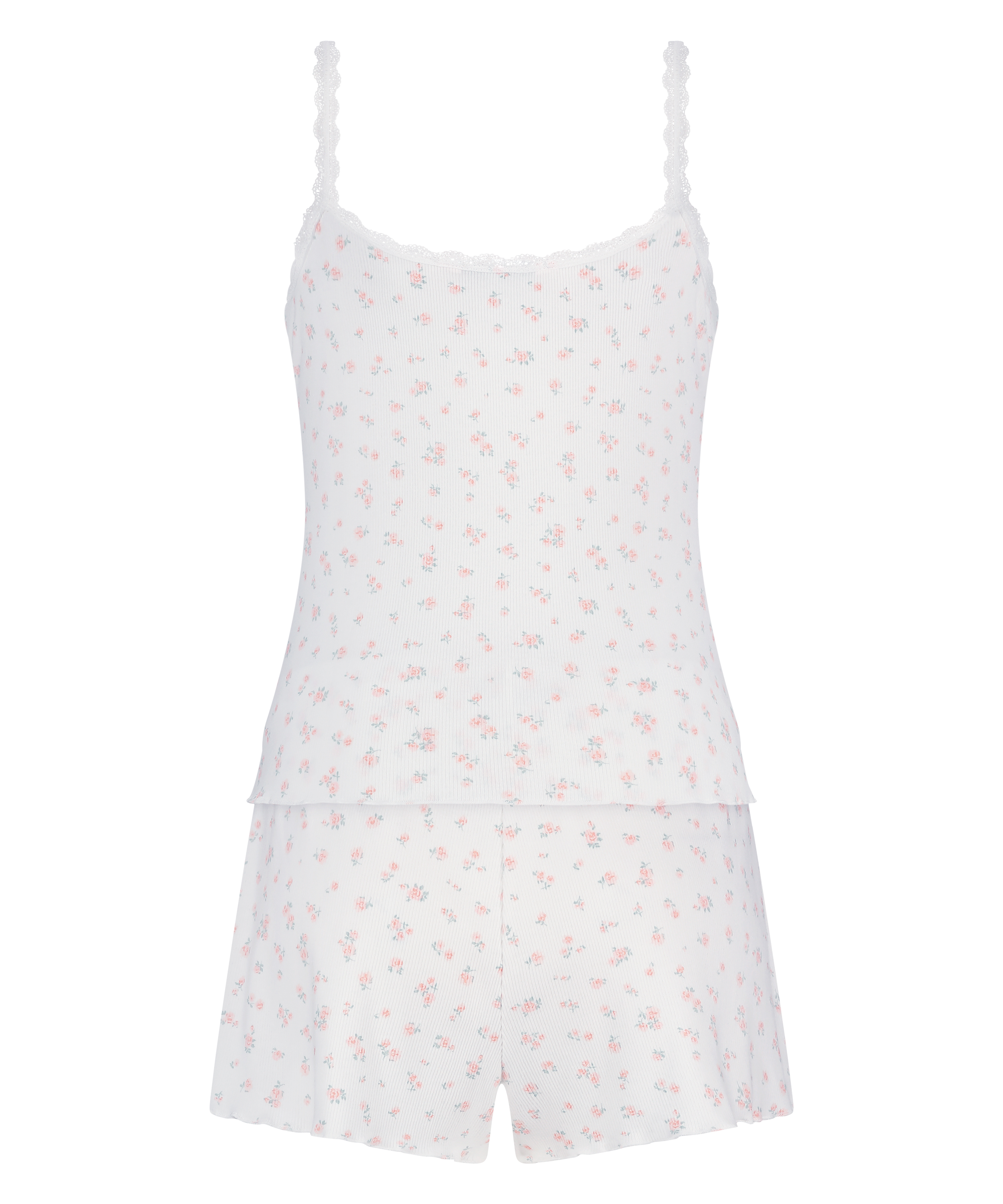 Upgrade your sleepwear with out pyjama set. This two-piece set includes a soft, ribbed top and matching shorts, designed for a relaxed and comfortable fit. The top features lace detailing along the neckline, adding a feminine touch to the cozy design.