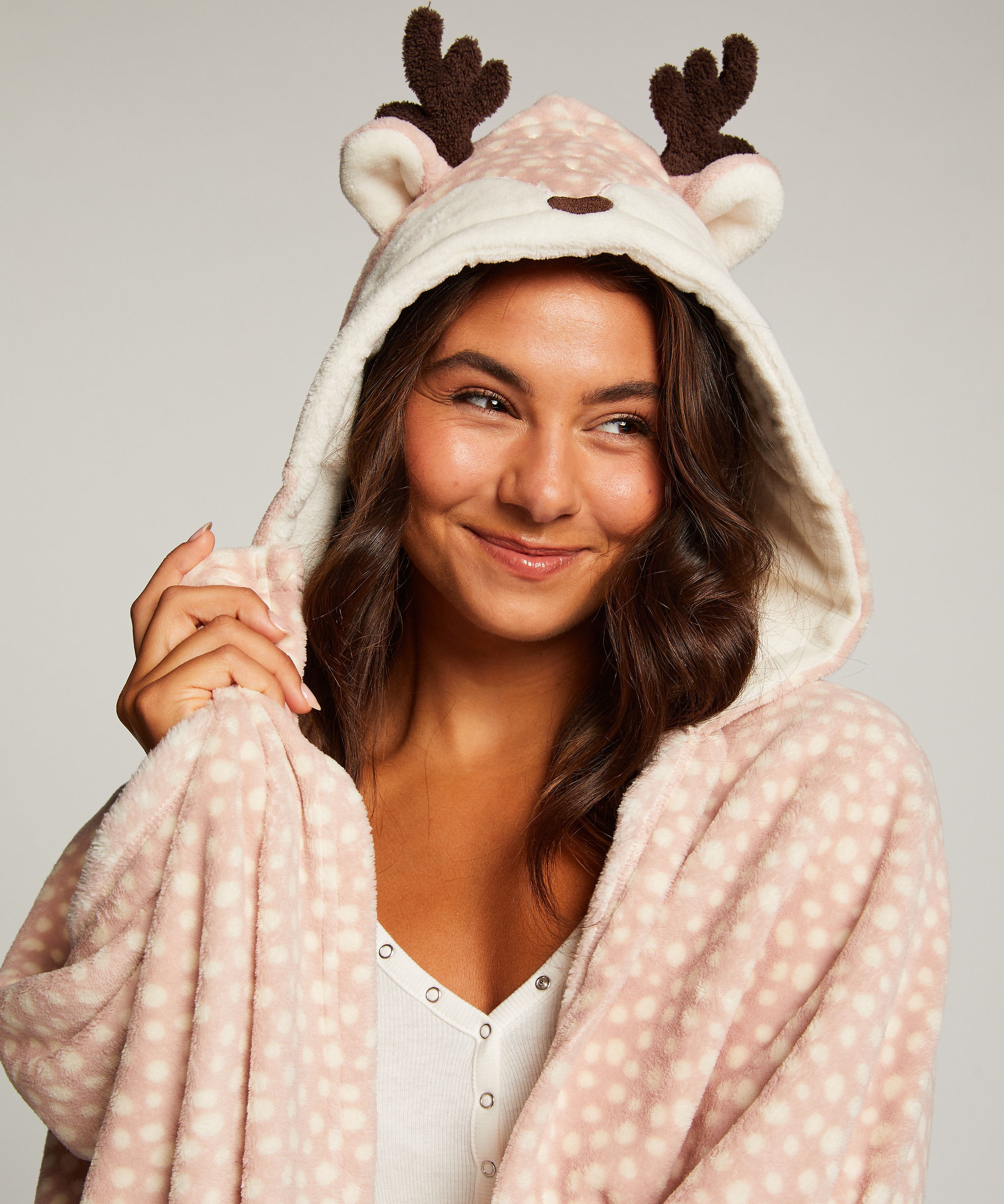 Great for the winter! This fluffy blanket will keep you warm and cosy. Complete with hood with reindeer details. 125cm x 170 cm.