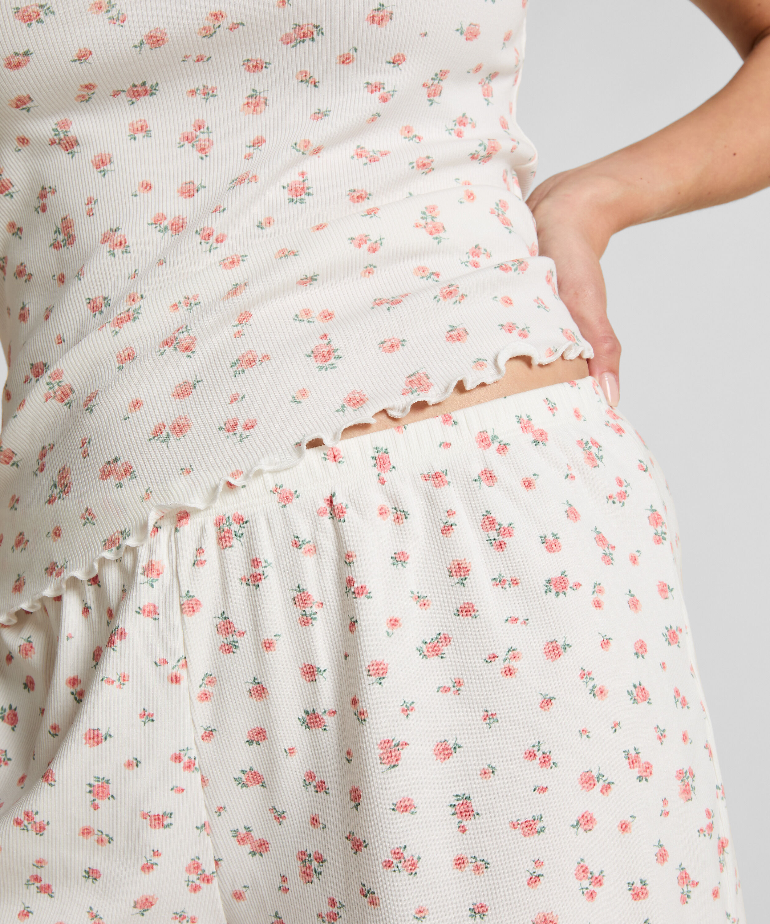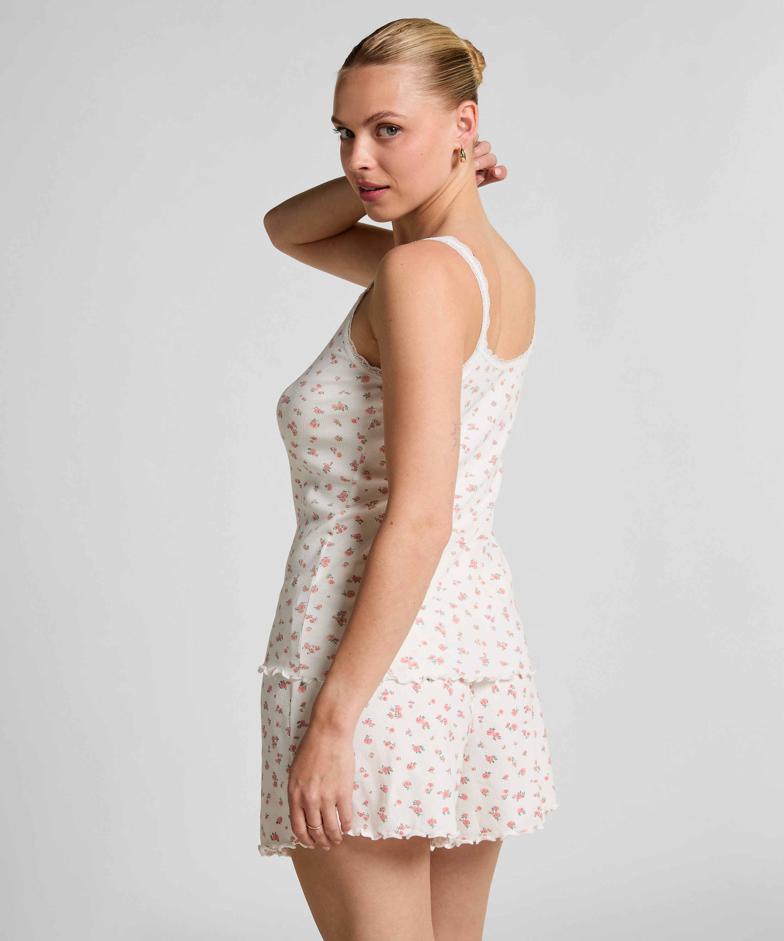 Delicate details for dreamy days and nights! This sleeveless ribbed cami features lace-trimmed straps and neckline, a sweet front bow, and soft ruffles at the hem—your go-to for a touch of charm and comfort.