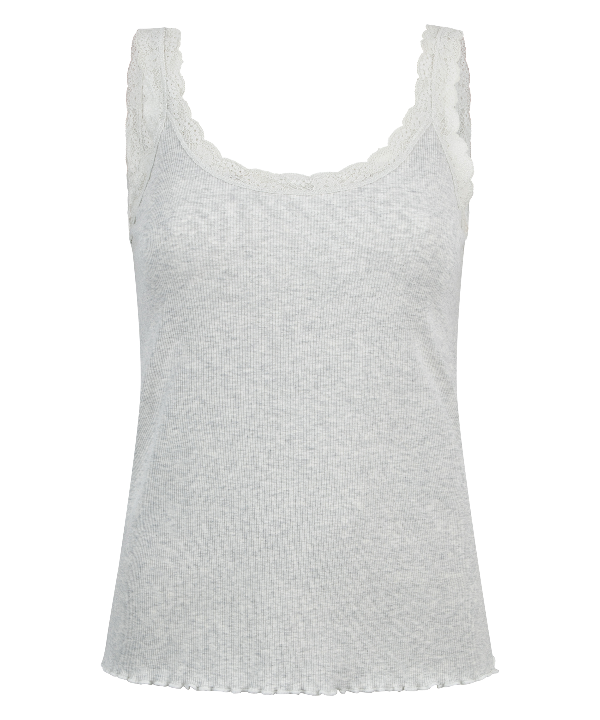 This singlet is made from ribbed cotton and is finished with an elegant lace edge. Combine this singlet with matching shorts. Comfortable to sleep in but also a great top to wear out!