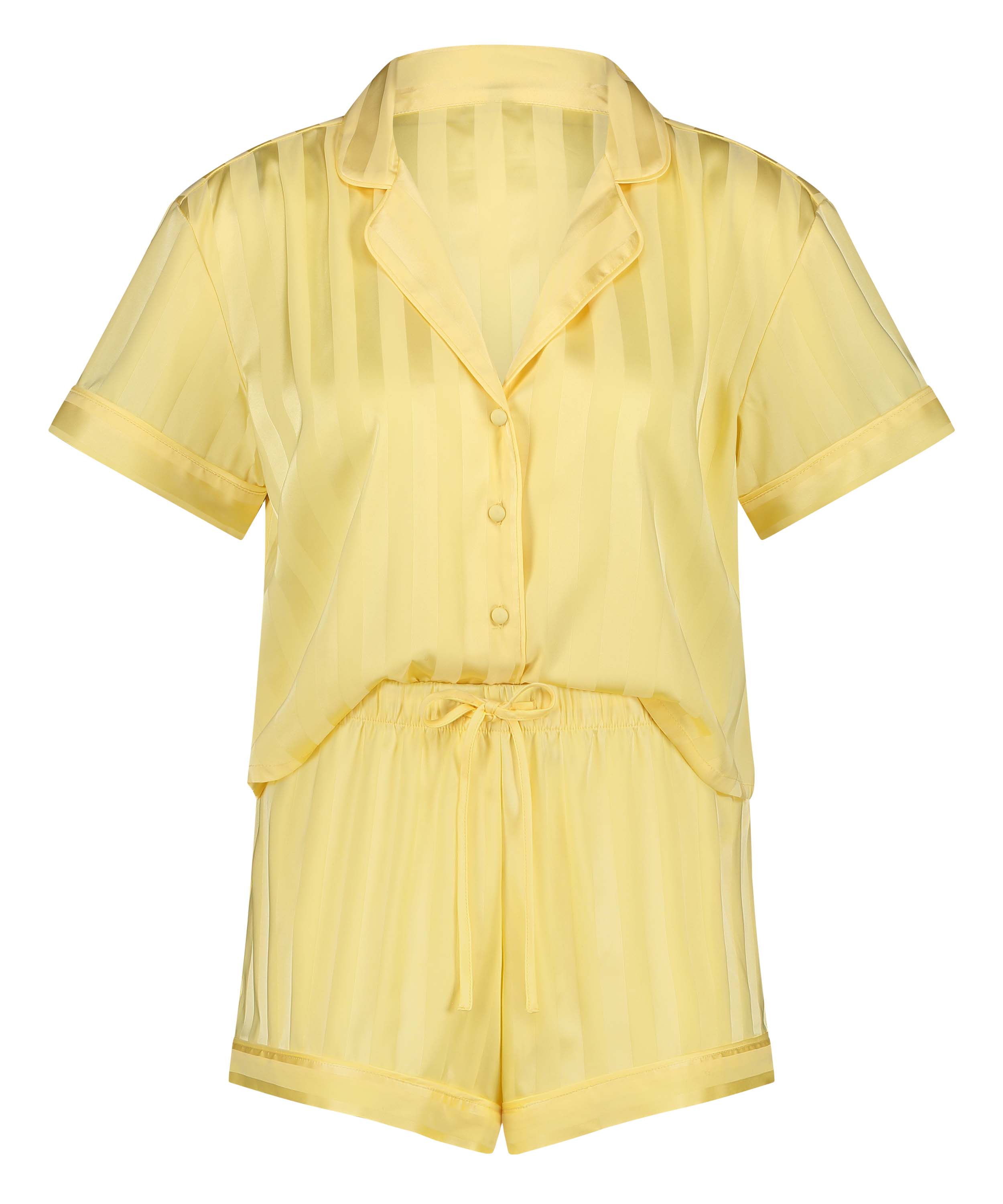 This luxurious pajama set is made from soft, silky satin and features a relaxed fit for ultimate comfort. The top has a classic button-down closure and short sleeves, while the shorts feature an elastic waistband with a drawstring for a customizable fit. The striped pattern adds a touch of sophistication to this classic loungewear style.
