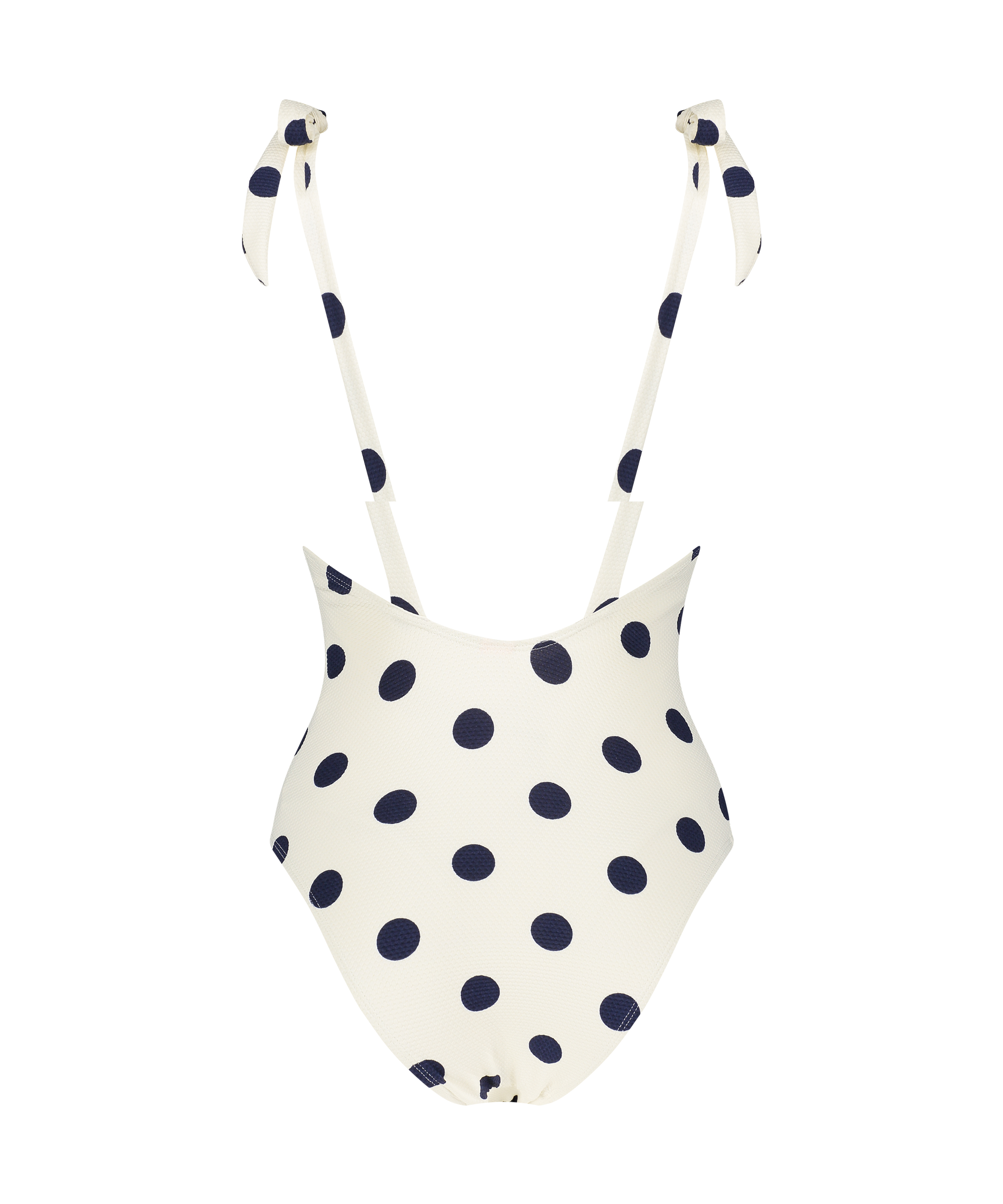 Stand out this summer in this cheerful swimsuit! The swimsuit is made of a dotted fabric with a scallop pattern. Combine with matching accessories for a beautiful look!