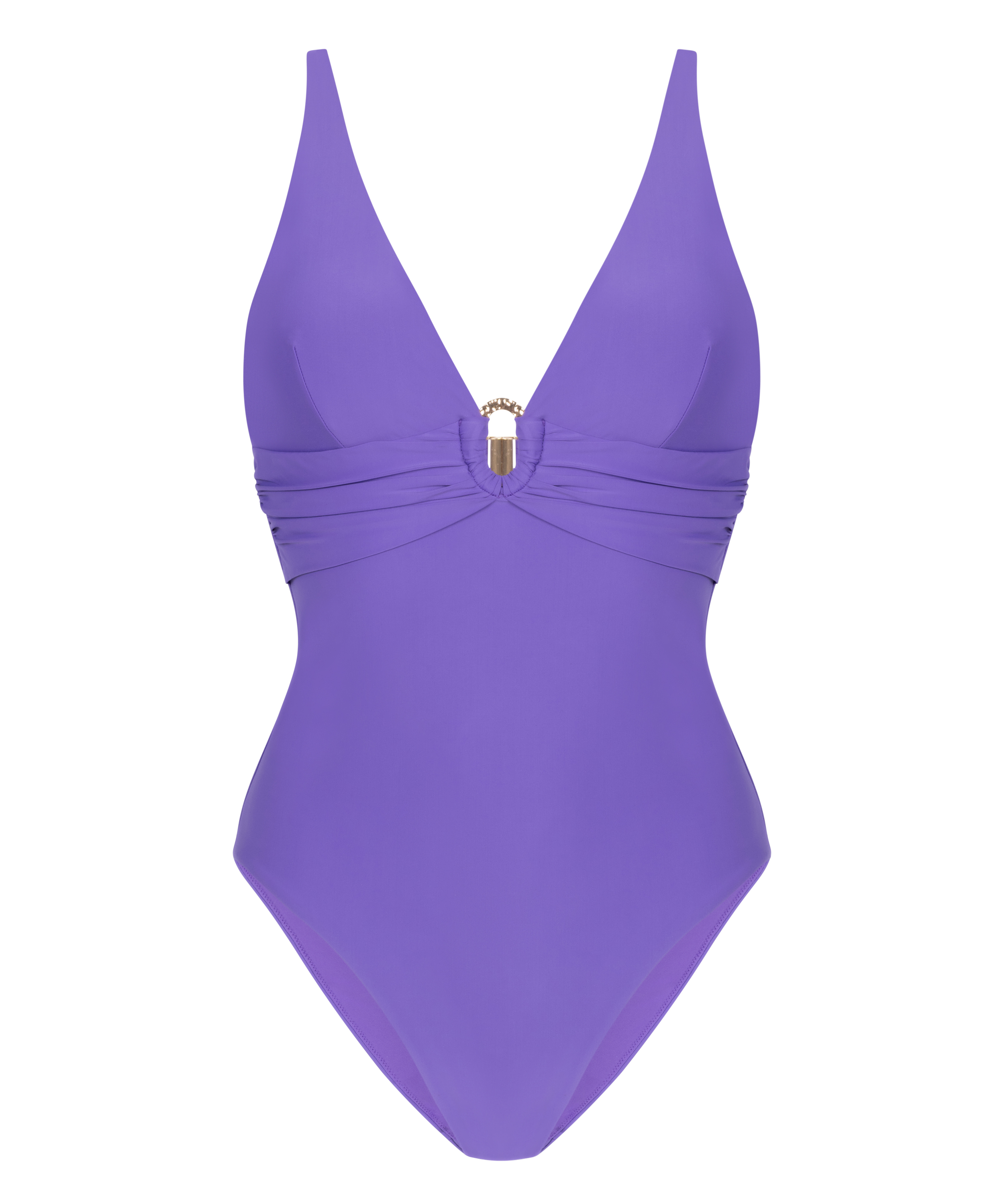 Turn heads from every angle in with our luxe swimsuit, designed with adjustable straps for a custom, comfortable fit and a chic triangle cut front that adds a touch of effortless allure; finished with a gold ring detail at the center. This swimsuit blends elegant shine with modern beach glamour ... your perfect go to for a confident, sunkissed silhouette.