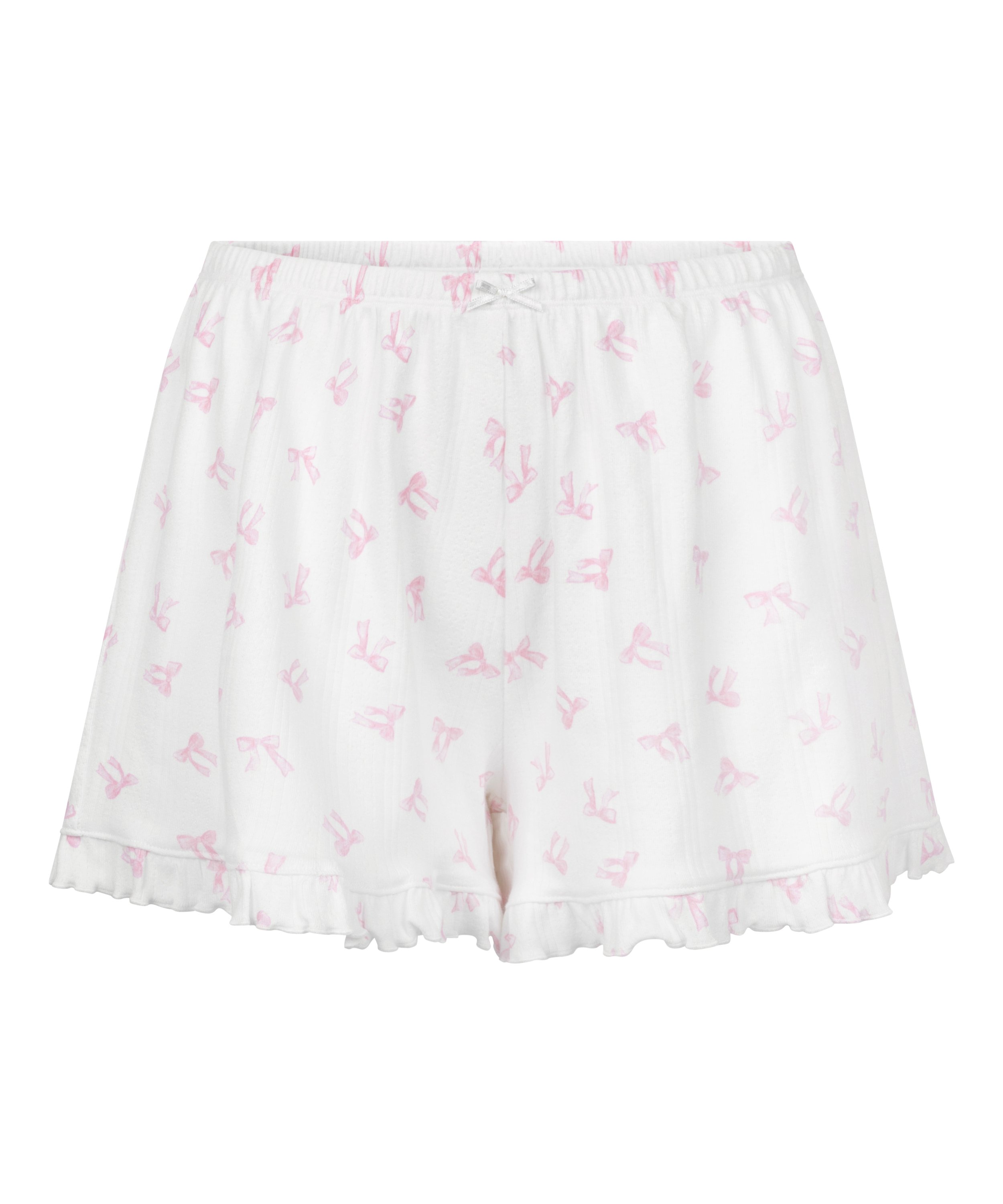 Add a touch of sweetness to your sleepwear with our Pointelle shorts. Made from pointelle fabric, these short feature a textured pattern that feels as lovely as it look. A playful ruffle adds a flirty and feminine flair, while the bow at the center makes the look complete. Combine with the matching pyjama top for a complete look.