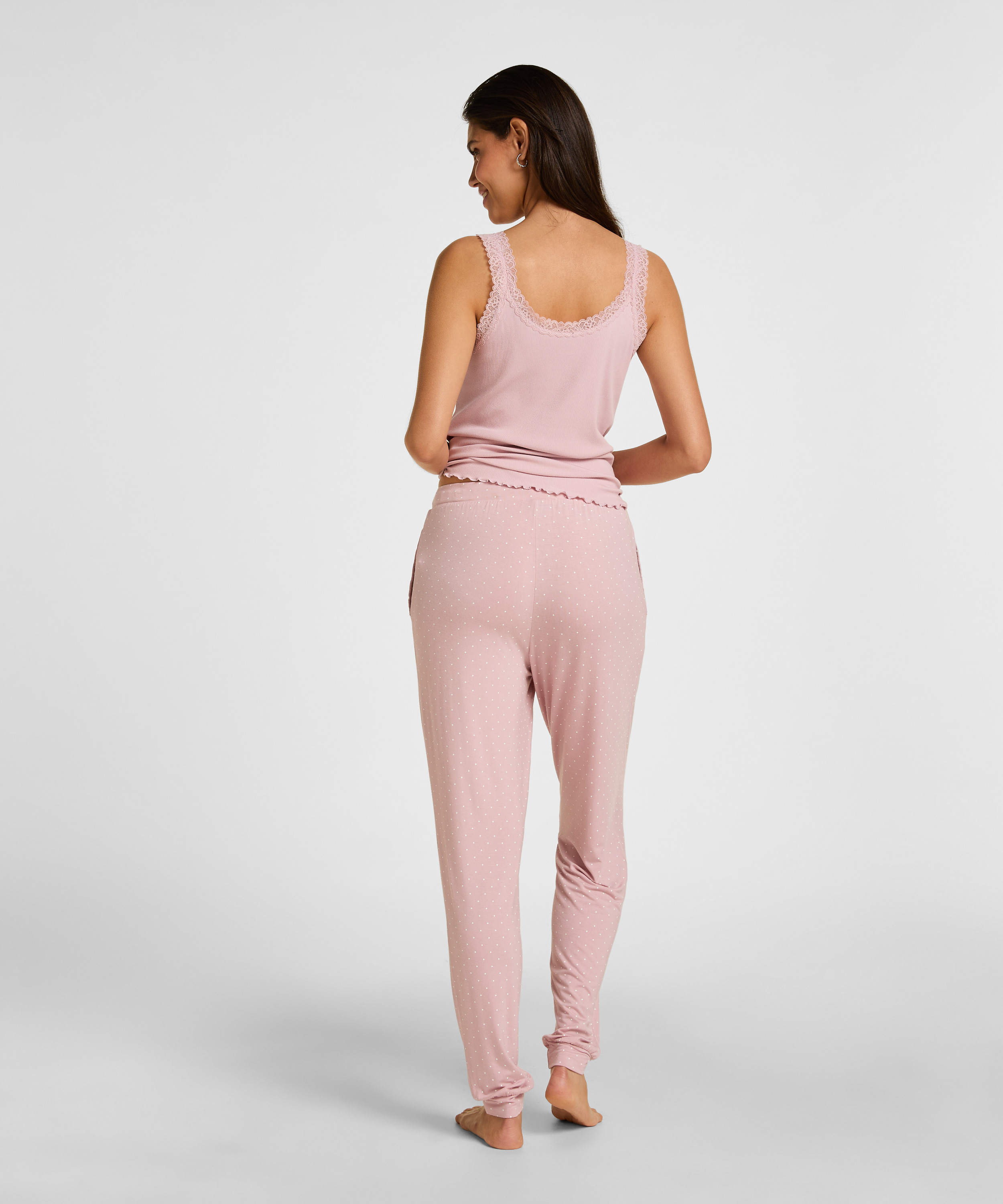 Add a touch of elegance to your everyday pyjama essentials. Made from soft, stretchy ribbed fabric, it hugs your body comfortably while offering a flattering, form-fitting silhouette. The lace adds a feminine, romantic details that elevates this simple piece. Perfect for lounging or a good night sleep.