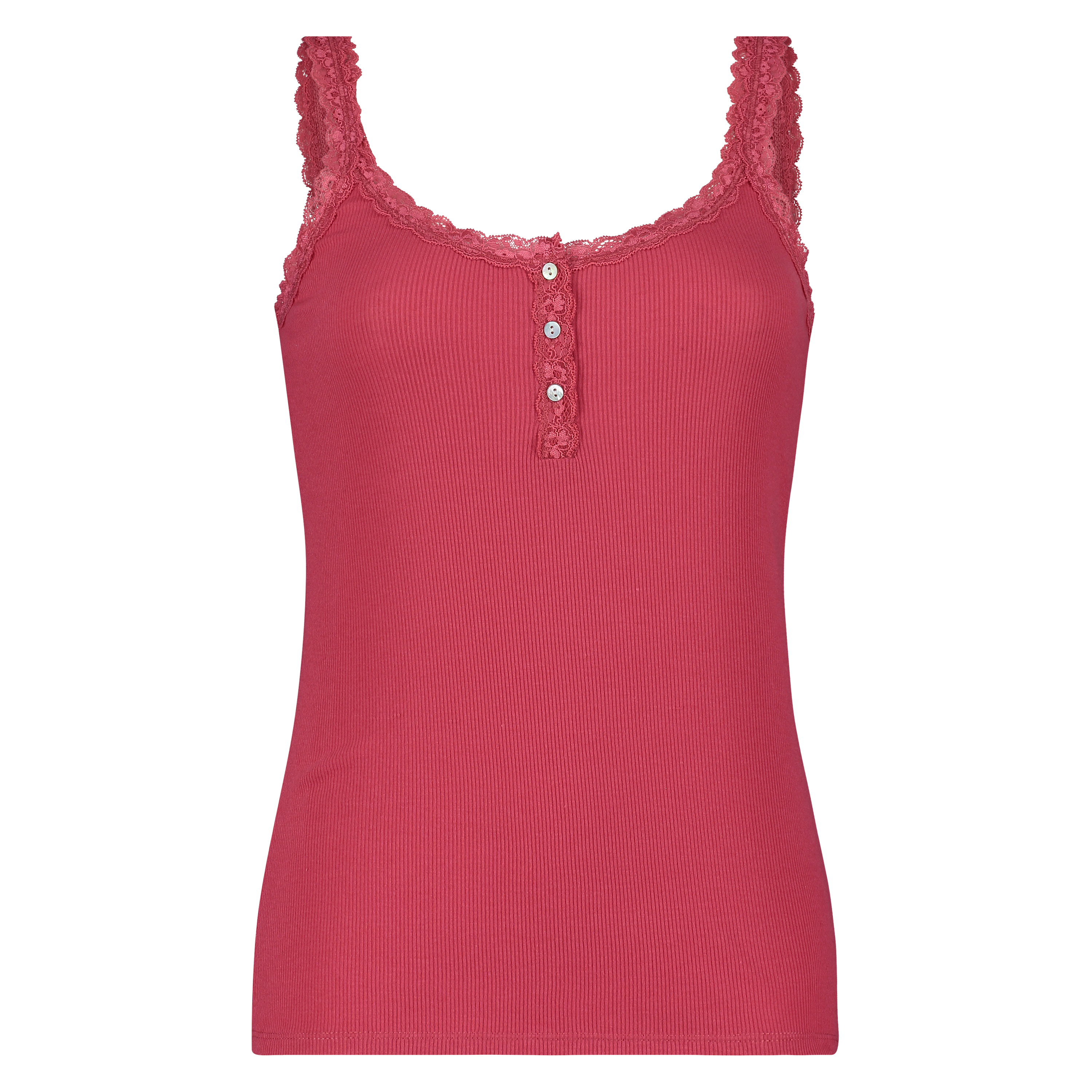 This singlet is made with a ribbed pattern and finished with floral-patterned lace edging.