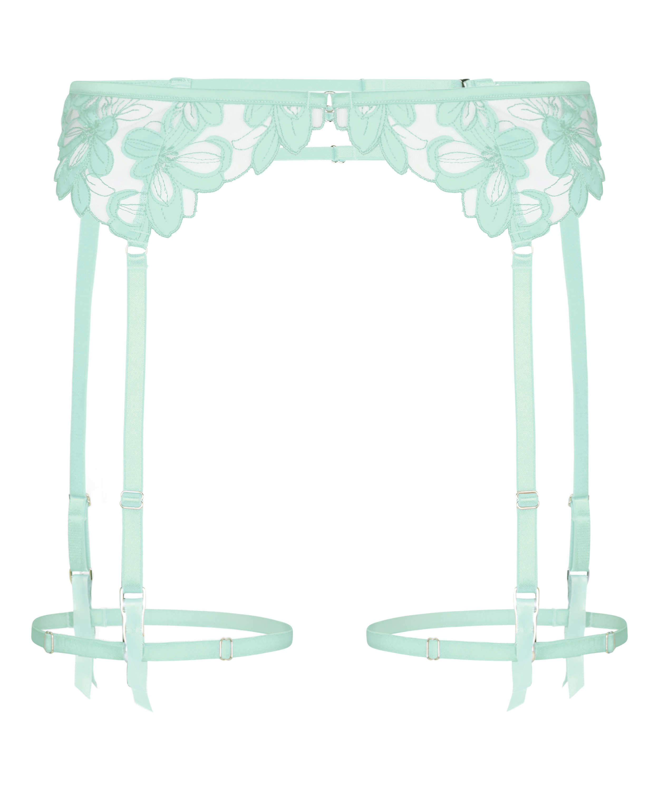 A delicate suspender belt with sheer floral lace at the waist and sleek satin straps that fall smoothly along the hips. Adjustable garter straps allow an easy fit and keep stockings securely in place without digging in. The lightweight construction keeps it comfortable while still creating a defined silhouette. Designed to layer seamlessly with matching lingerie for a complete, polished set.