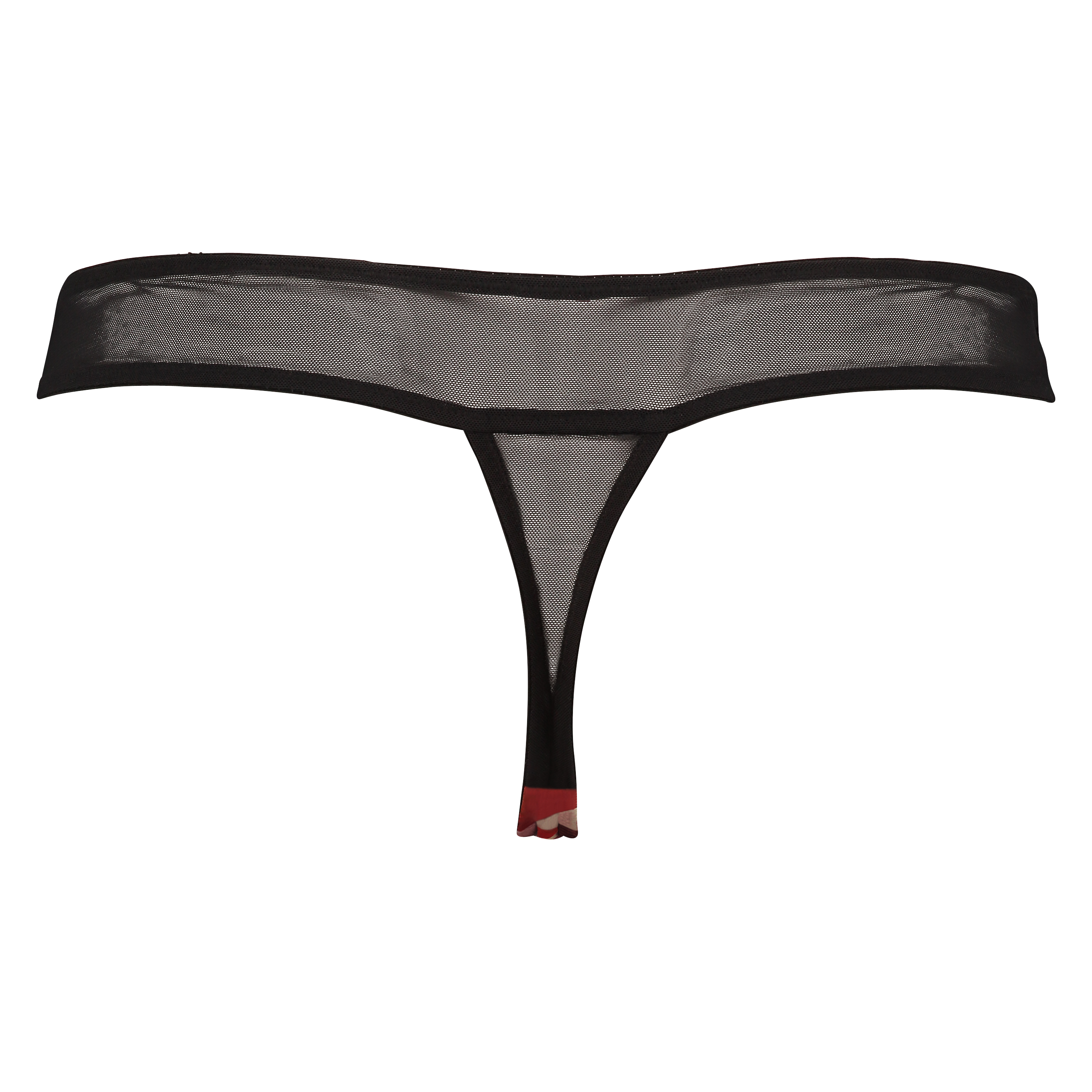 This black thong features a floral roses print and is made from fabric with a satin look and feel. The back is made from black semi-transparent fabric.