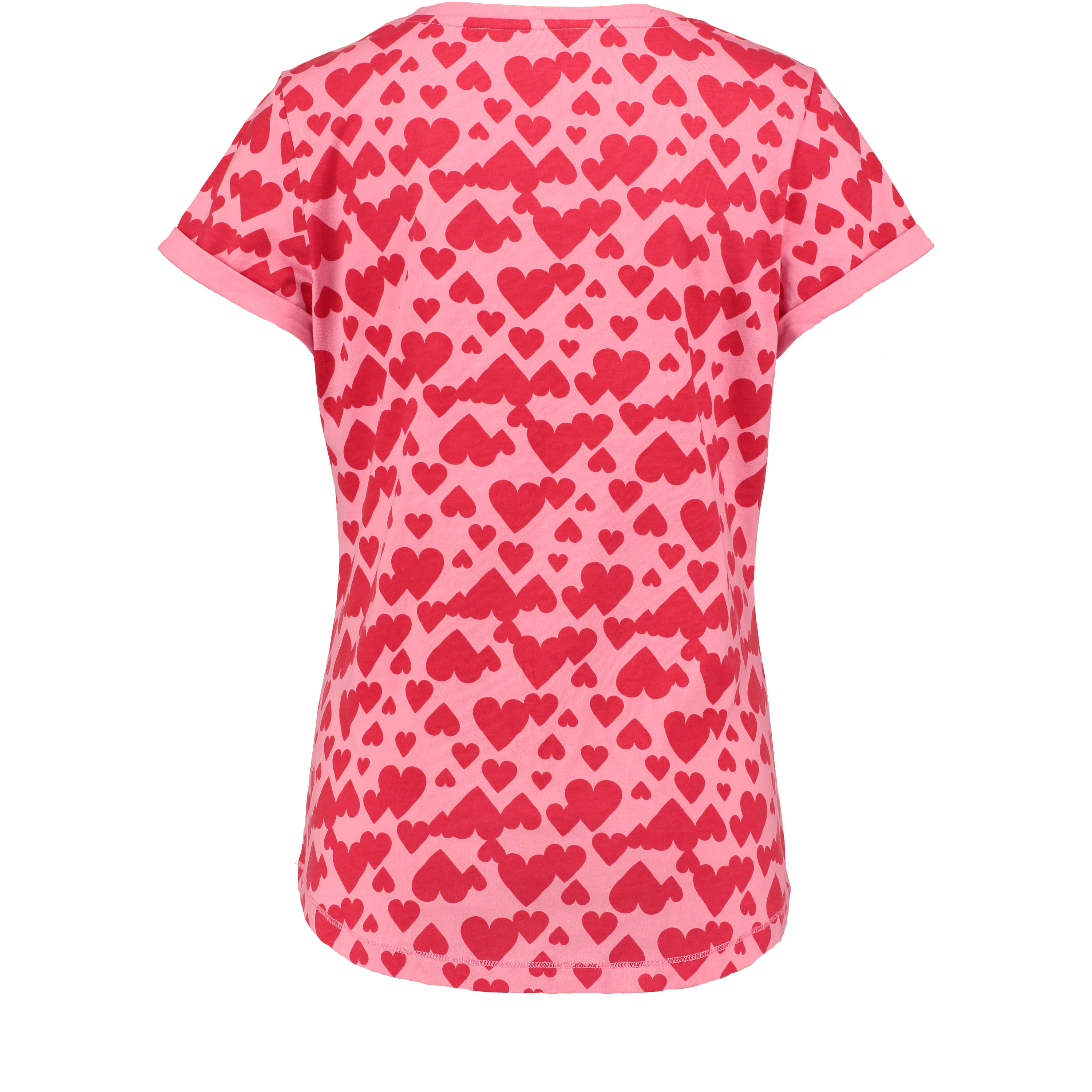 This cheerful top looks lovable. The top is pink with an all-over pattern of red hearts.