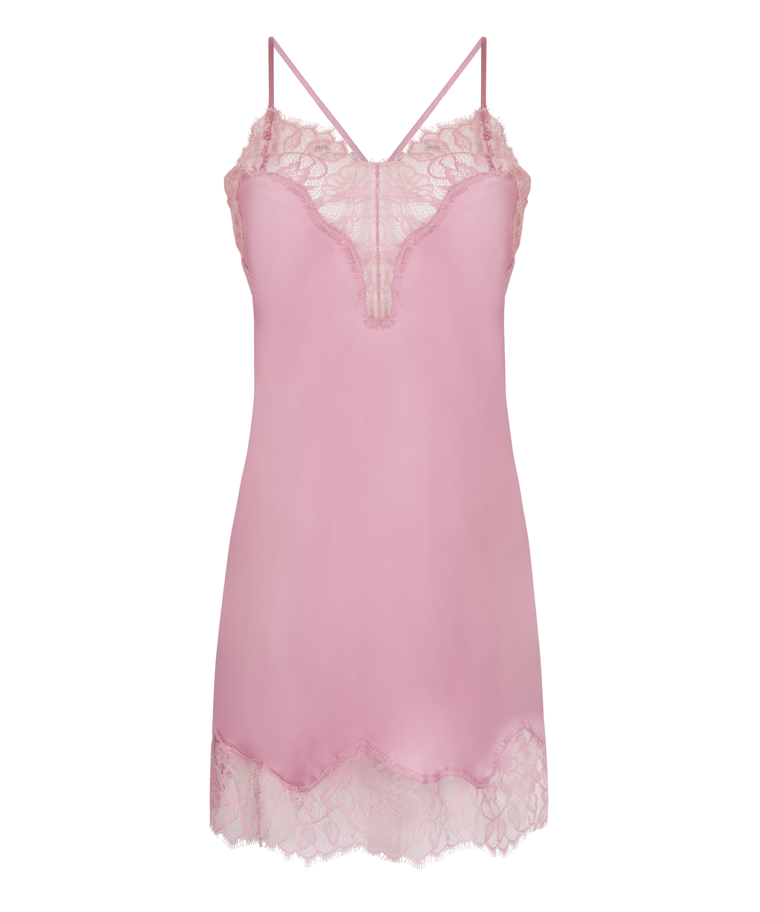 This slip dress is a must-have for your elegant collection! It is made of satin, has a beautiful v-neck and contains beautiful lace details. Combine with a matching kimono for a complete look. Part of the Noir collection.
