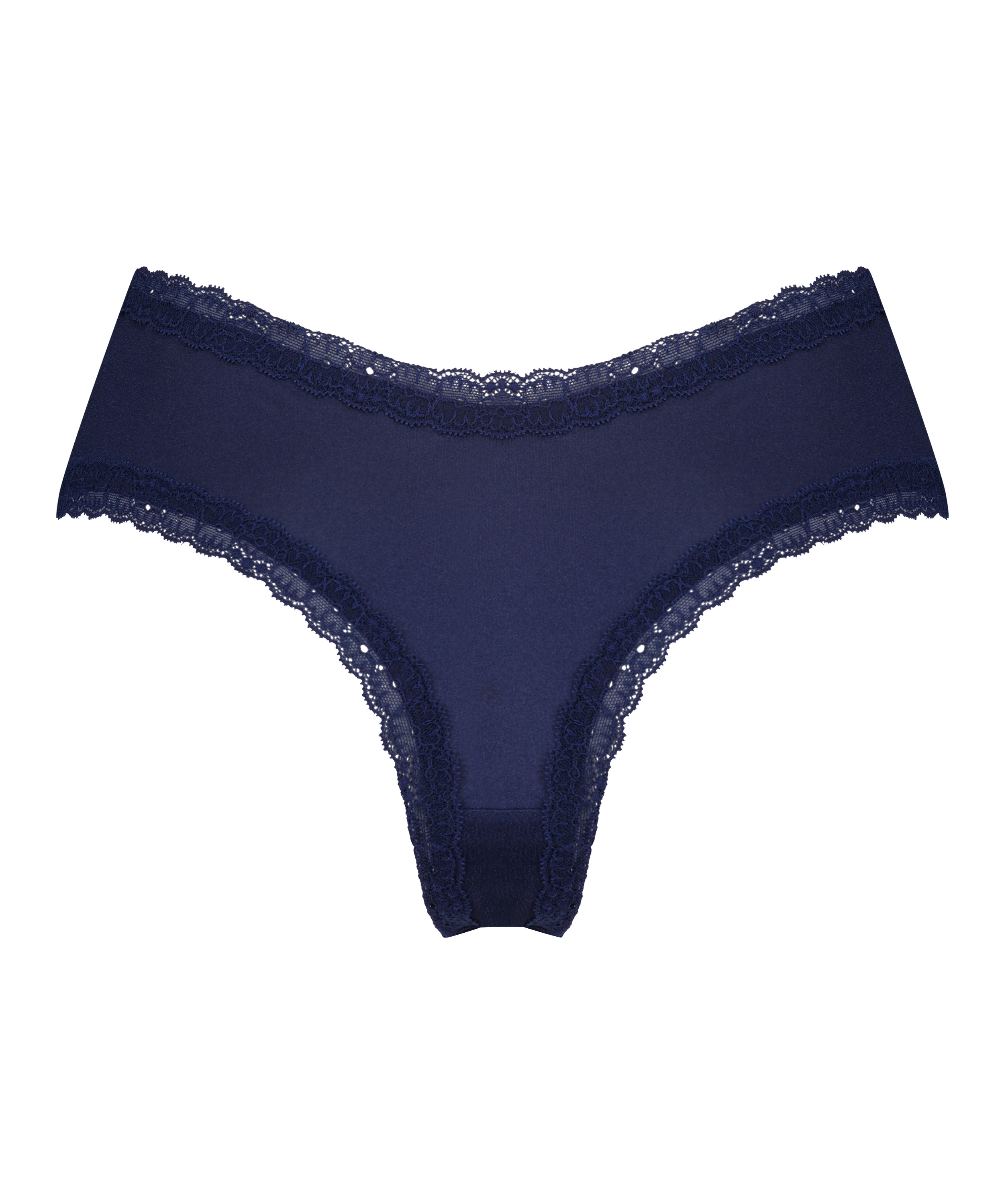 This V-shape brazilian is always a winner! The edges are made of lace and at the front there are strappy details. There is also a small bow underneath. Easy to combine with different bras from our collection!