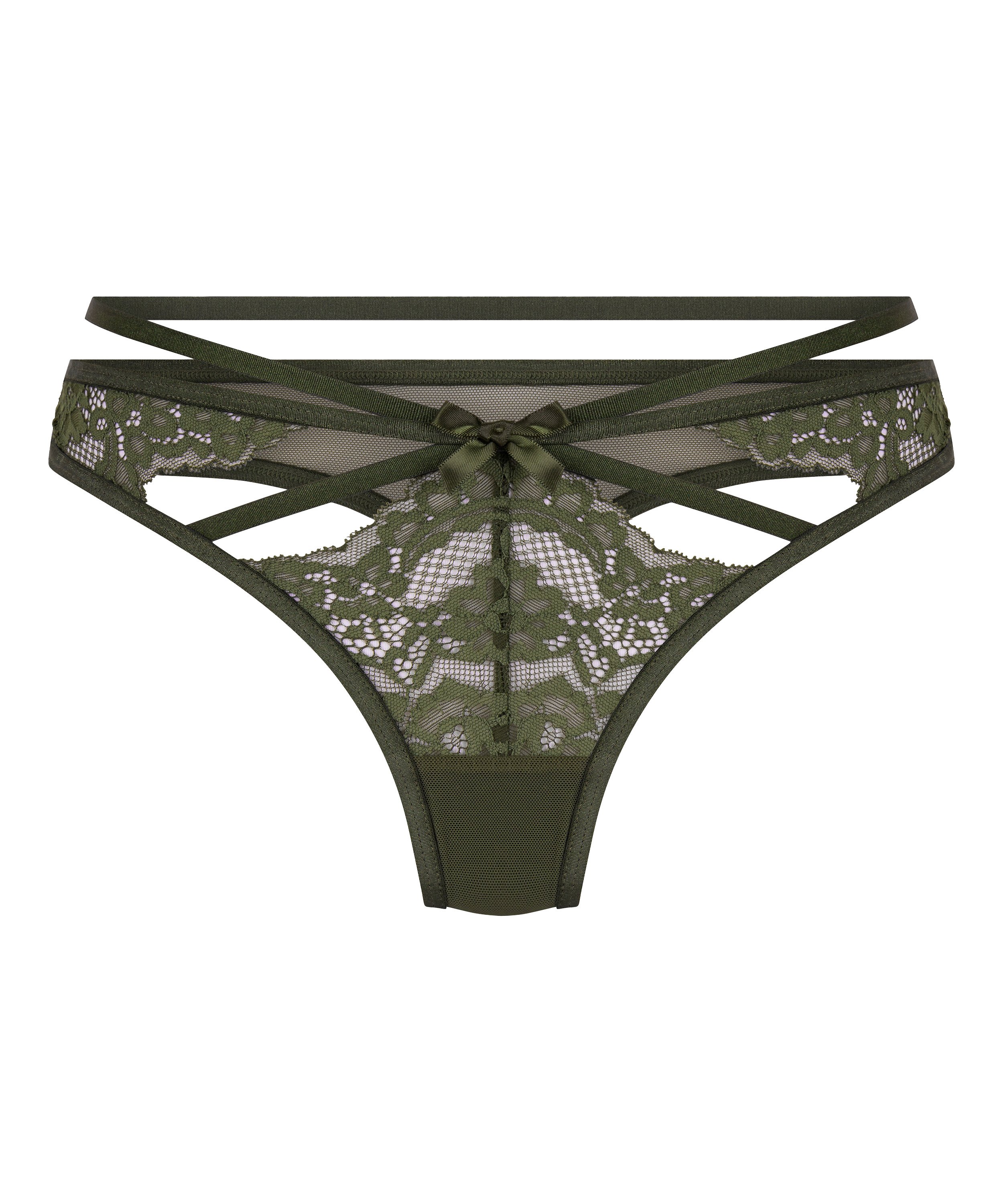 Feel irresistible in this thong! The thong has lots of lace and cut-out details. The thong also has strappy detailing. Combine with a matching bra.