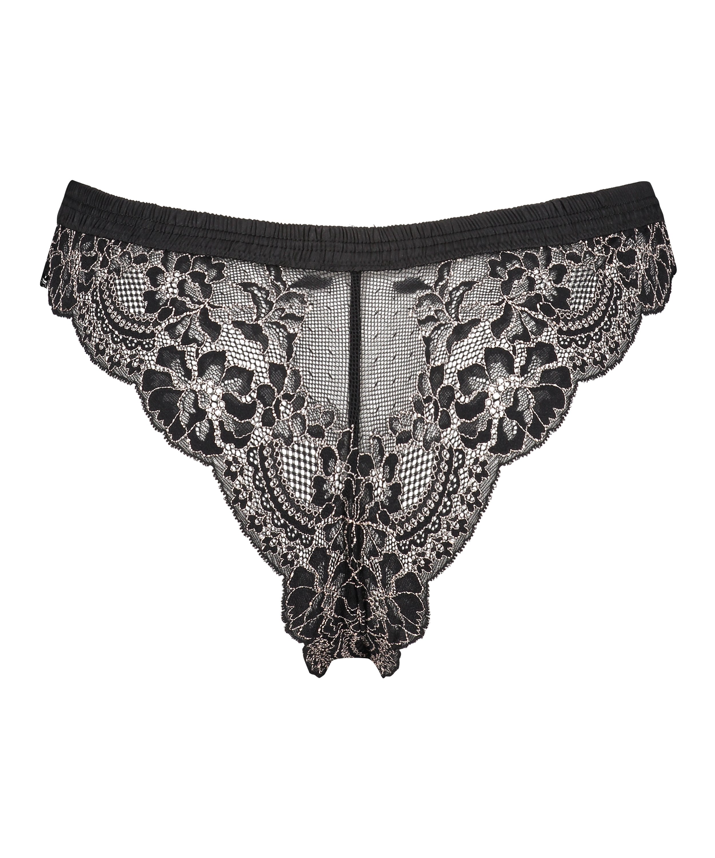 The stuff dreams are made of! These lacy Brazilian knickers have a pretty trim around the legs. They are high leg, to make your legs appear longer. Combine with a matching bra or bralette for a complete set.