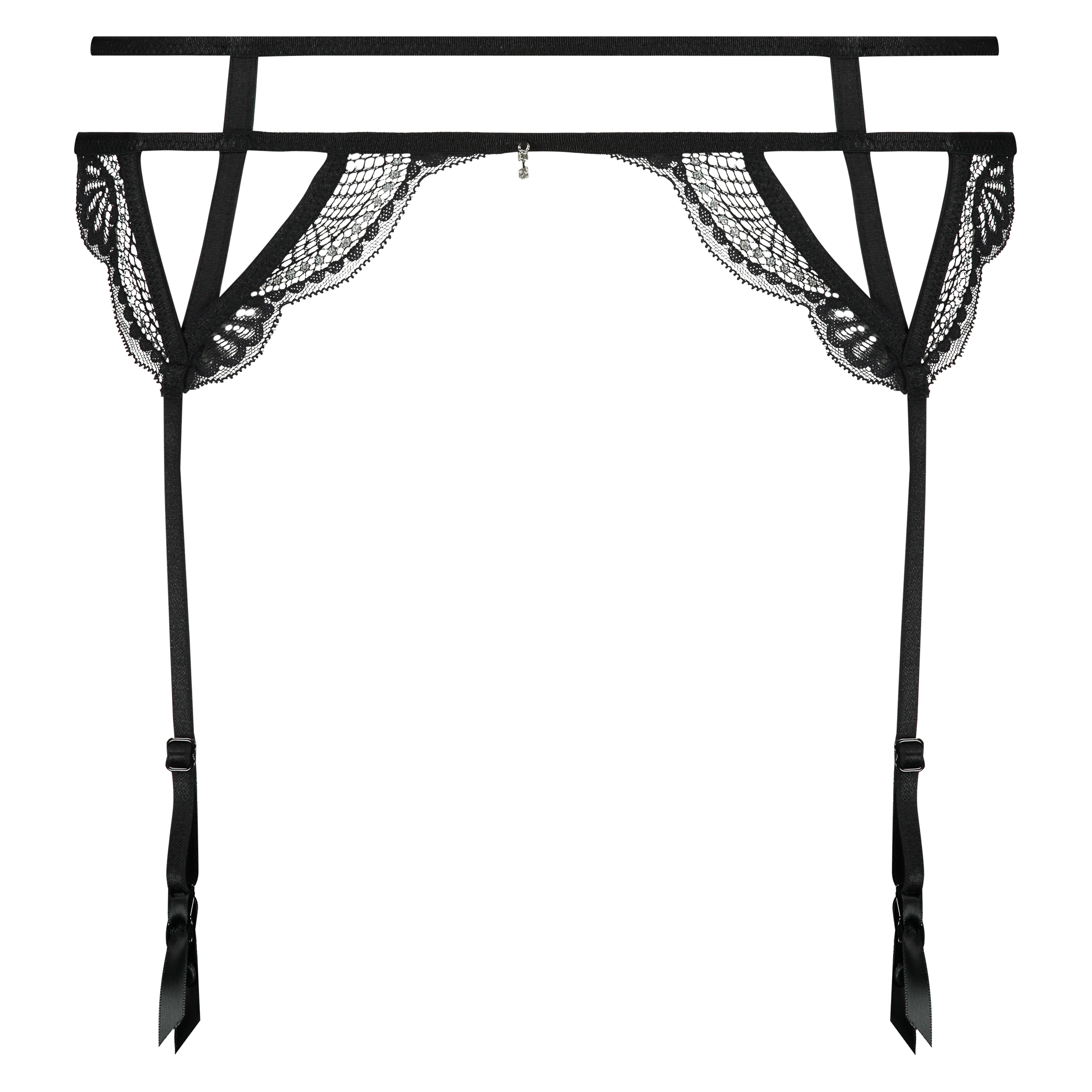 Complete your sexy look with these suspenders! The suspenders consist almost entirely of strappy details and have delicate lace trimming with rhinestones on the front and back. Combine with the matching Private bra & knickers for a complete set!
